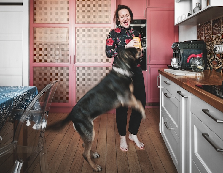 „Spolupráce s Martinou a Martinem byla za odměnu! Byli upřímní a hovorní, což je při komunikaci s klientem důležité. Bavilo mě sledovat, jak celá rodina drží při sobě, což se projevilo při požadavku na trávení volného času: nejradši se totiž všichni zašijí do kuchyně. Jeden vaří, druhý píše úkoly, třetí si čte a čtvrtý trénuje s míčem. Zásadní tedy bylo koncipovat prostor jako multifunkční, aby tu bylo pohodlné místo na vaření, práci, zábavu i relax. Televizi byste tu hledali zbytečně, nikomu nechybí. Bála jsem se, co Martina řekne na výrazný odstín skříně na spotřebiče a kotel, ale byla nadšená, starorůžová je prý její oblíbená barva! A klobouk dolů před Martinem, který si s kamarádem vzal celou rekonstrukci na hrb, zvládli to dokonale: od podlahy přes výmalbu až po lepení originálních dlaždic za linkou,“ vypráví designérka Pavla Kirschner.  „Pro obklad na stěnu za linkou mě poslala Pavla do obchodu Los Kachlos. Vůbec jsem netušil, jaký vybrala, a špatně jsem si asi opsal kód, takže jsem se vrátil s úplně jinými dlaždicemi. Ale zamilovali jsme se do nich a už si je nechali, i Pavla souhlasila. Lepil jsem je sám a musím říct, že mě to docela bavilo, hlavně vymýšlet, jak jednotlivé díly poskládat, aby nám bylo příjemné dívat se na ně celý život,“ říká Martin, který si proměnu nemůže vynachválit. „Na rovinu? Jsme nadšení! A hned se přiznám: vždy jsem přehlížel profesi designéra a myslel si, že je to zbytečná služba, kterou nepotřebuju. Že jsem schopný si změny v bytě vyřešit sám. Ale jen jsem o nich začal uvažovat, došlo mi, jaký jsem laik! Všem doporučuju, ať odhodí českou malost a škudlení na nesprávném místě. Když si totiž připlatíte za odborníka, naopak ještě ušetříte a vyvarujete se mnoha chyb. Pavla nám dokonale zařídila kuchyň na míru provozu, který jsme jí předtím sáhodlouze a detailně popsali. Život v ní se totiž během roku mění: přes prázdniny je vytíženější, jak jsou kluci doma i přes den, od září ožívá až odpoledne a největší fičák bývá vždy večer: každý den chystáme teplou večeři a u stolu většinou opravujeme se ženou písemky. Pavla vnesla do našeho chaosu klid a řád. A za to jsme moc rádi.“