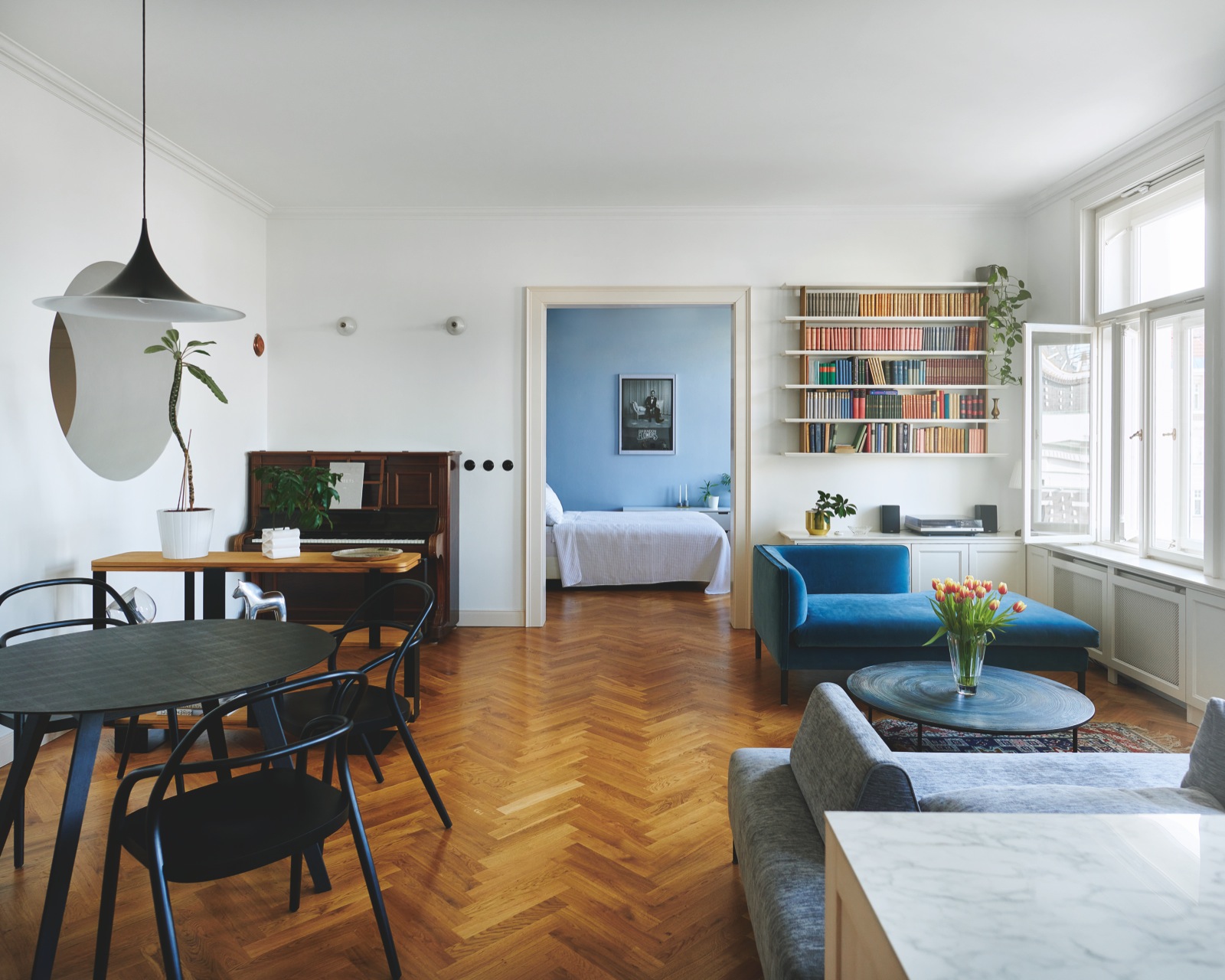 Vinohrady jsou vyhlášená pražská čtvrť, které vévodí kostel Nejsvětějšího Srdce Páně architekta Jože Plečnika. Známý je legendárními prosklenými hodinami o průměru skoro osm metrů. Jejich odkaz je pointou tohoto bytu. „Občas přišel pro radu nebo konzultaci a od začátku jsme cítili, že jsme na stejné vlně. Z náhodných setkání se nakonec stala spolupráce a z Filipa s Michalem klienti,“ říká Adéla. Bylo to v době, kdy mladá architektka ještě ani neměla vlastní kancelář, a všichni tři se tak scházeli v původním bytě obou partnerů, ve stejném domě, o poschodí níž. „Až teď s odstupem času vidím, jak velké štěstí na klienty jsem hned na začátku měla a jak šlo všechno hladce. Tehdy jsem si myslela, že to je běžná věc a zpětně děkuju osudu, že mi je přihrál do cesty. Stali se z nás přátelé a zrovna jim pomáhám rekonstruovat chalupu,“ vypráví Adéla. Byt má rozlohu 120 metrů čtverečních a okna do dvou světových stran. Cesta, kterou si s Michalem a Filipem společně vytyčili, byla jasná – obnovit genius loci, jehož definitivně zabila poslední rekonstrukce v 90. letech. S respektem k původním dispozicím tak v bytě zbourali jedinou příčku, aby propojili kuchyň s obývákem, což byl jeden z hlavních požadavků klientů. V nově vzniklém centrálním prostoru tím pádem zůstaly jedny dveře do chodby navíc.