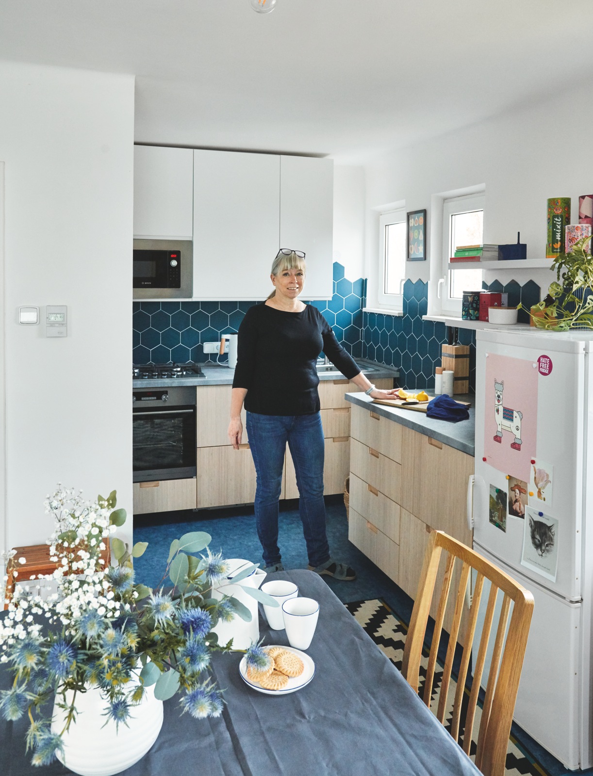 „Když začínám s proměnou, vždycky klienty poprosím, aby mi ukázali fotky interiérů, které se jim líbí. Někdo pošle nástěnku z Pinterestu, jiný tři fotky, ale vždycky je to lepší než tisíc slov. Takže Dora s Ondrou mi poslali pár nápadů, já jsem navrhla několik cest a rychle bylo jasné, že se budeme držet kombinace bílá plus dřevo a hledat výraznější třetí barvu. Nejsem zastáncem názoru, že do malých prostor patří jen světlé odstíny. Naopak, proč si šikovně nepohrát s výraznější paletou? Jsem proto moc ráda, že souhlasili nejen s odvážnou modrou, ale i výrazným šestihranným tvarem, který umožňuje vytvořit hravé zakončení. V malých kuchyních je také osvěžující udělat horní a spodní skříňky v jiné barvě: tmavší a opticky těžší by ale měly být vždy dole a světlejší nahoře, abychom dosáhli vzdušnějšího dojmu. Tady se to hezky povedlo,“ říká designérka Radka Vyplašilová.