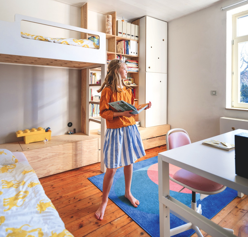 Ráda doporučuju palandu, šetří prostor, je zábavná a děti ji milují. Tahle je vyrobená na míru, je ze silnější překližky a pevně spojená se stěnami, takže vůbec nevrže a nekymácí se, když dítě leze nahoru. Obecně dřevěné postele lépe izolují zvuk než kovové. A pokud jde o oddělení dvou lůžek, dobře fungují optické předěly: mobilním paravánem, knihovnou bez zad nebo lehkým závěsem ze stropu.