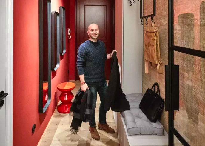 Když Ondřej s designérkou Alexandrou Dýckovou stáli na startu v prázdné předsíni, byla to trochu marnost. Úzká nudle s bílými stěnami bez denního světla, která končila malým dveřním otvorem. K tomu tu měla podle stavebních plánů stát i pračka. „To jsem okamžitě zamítl. Jiné konkrétní představy jsem v tu chvíli ale neměl. Věděl jsem jen, že i předsíň chci pojmout v trochu asijském stylu a zároveň minimalisticky, stejně jako další místnosti. Že chci mít možnost pověsit kabát, který nosím denně, jednoduše na háček, a zároveň tu mít co nejvíc uzavíratelných úložných prostor. Nemám totiž rád, když jsou vidět věci, které vidět být nemusejí. A samozřejmě jsme řešili, jestli do průchodu, kterým chodba původně končila, pořídit dveře, nebo ho vybourat,“ vysvětluje Ondřej a designérka dodává: „Podobu předsíně zásadně ovlivnily masivní dřevěné vchodové dveře, které byly nové a nemělo smysl je měnit ani nijak upravovat. Jejich hnědo-vínová barevnost na pozadí bílých stěn nepříjemně bila do očí. Potřebovali jsme také skrýt skříňky na internet a další sítě, které jsou standardně nad vchodovými dveřmi a ze své podstaty jsou dost ohyzdné. To všechno pomohla vyřešit sytá barva, kterou jsme použili na část stěny. Díky ní nejsou dveře tak nápadné, ale místnost s ní také působí útulněji. Celkovou atmosféru uklidňuje vliesová tapeta s povrchovou strukturou i barevností připomínající jutu a industriální prvky, jako je závěsný systém z černého kovu nebo kovové dveře s prosklením. A i když je navazující část bytu spíše neutrální, zařízená v kombinaci černé, bílé a jemných struktur přírodních materiálů, výrazná chodba si s ní rozumí.“