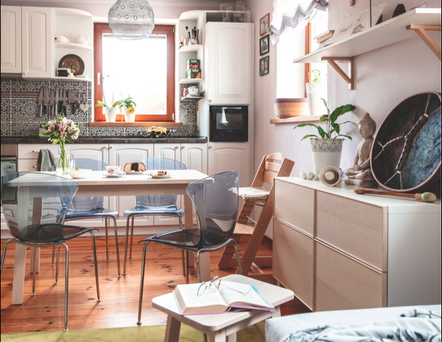 Velkou změnu udělal nový jídelní sůl a komoda, kterou rozsvítily dvířka ze světlého dřeva. Středobodem obývací části se nakonec stala nově přečalouněná a pohovka, nad níž se vyjímá obraz mandaly jako symbol rovnováhy. Designérka Pavla pomocí barev a vzorů dosáhla v interiéru harmonie, která přirozeně nabádá k odpočinku a meditaci. Zároveň se jí tu povedlo vytvořit i hravé a veselé prostředí pro malou divošku.