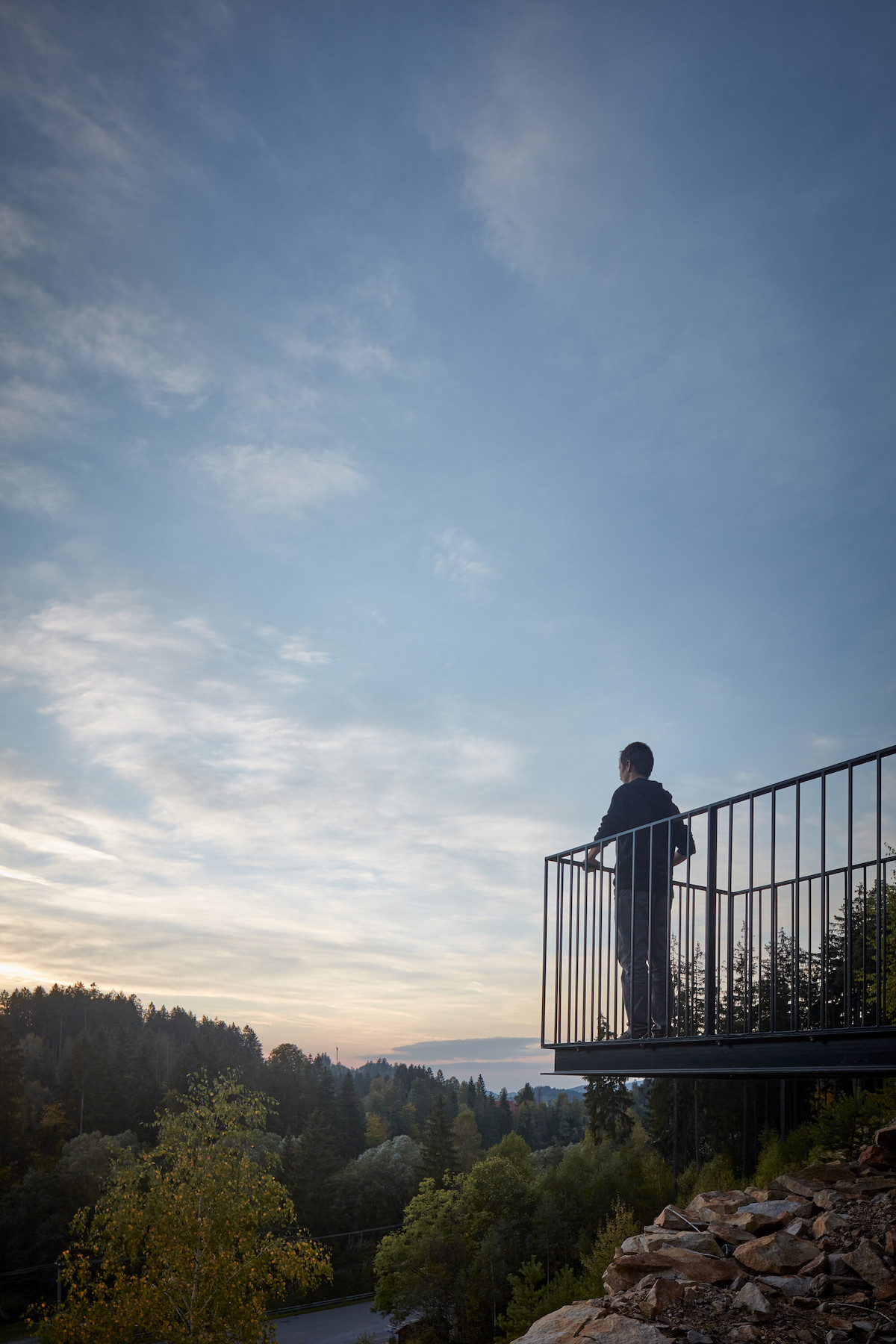 Mírnější trasa vede nově vysázeným lesem se směsicí místních druhů dřevin, které budou v budoucnu sloužit jako arboretum odkazující na blízkou okolní krajinu. V místě sedla pod skalnatým vrcholkem návštěvníci vystoupají na malou vyhlídkovou piknikovou platformu. „Inspirací zde byly staré zarostlé ruiny kamenných základů rozeseté po Beskydech, dokladující osídlení a hospodaření předků v nejzapadlejších koutech krajiny. Vyhlídková plošina je vymezena od okolí nízkými suchými zídkami (základy domu), které vytvářejí rovinu mírně vyčnívající z rostlého terénu. Zídky slouží také k posezení a vyhlídce západním směrem do údolí Bečvy přes přehradní nádrž,“ vypráví Henkai architekti. Strmější trasa vede kousek za korunou lomu. V polovině horní lomové hrany, která je stabilní, je umístěna vykonzolovaná kovová vyhlídková lávka s podlahou z pororoštu, který umocní dojem z výhledu a navodí jemné chvění. Malá vyhlídka je odpočinkovým mezibodem při výstupu prudkým svahem a zároveň návštěvníkům zpřístupňuje přímý pohled na stěnu lomu, kde nyní probíhá přirozený sukcesivní proces. Cílem je vrcholová část kopce. Z dramatického terénu zde vyrůstají tři vyhlídkové objekty, tři subtilní prázdné krychle. „Objekty jsou jemně umístěné do stávající terénní modelace mezi balvany. Terén nemají narušit. Jsou jen jakýmsi architekturou vymezeným volným prostorem, který má vybízet k zastavení a spočinutí uprostřed lesa. Hlavní vyhlídka je umístěna přímo na vrcholu a umožňuje výhled přes lomovou stěnu do okolní krajiny luk a strání. Zbylé dva vyhlídkové body jsou zamýšleny jako místa pro pobyt, zamyšlení a posezení při pohledu do interiéru lesa, na jedné straně smrkového, na druhé borového. Pro vybudování zpevněných a nezpevněných stezek a opěrných zídek byl použit jako hlavní stavební materiál kámen a šotolina přímo z lomu. Stezky jsou doplněny mobiliářem z dubového dřeva. Z bezpečnostních důvodu je lom od okolí vymezen jednoduchými raženými dřevěnými dubovými kůly s lanovím. Nosná konstrukce objektů je montována z profilů a dílů z žárově pozinkované oceli v následné černé úpravě. Podlahy a konstrukce stropů jsou dřevěné fošnové,“ uzavírají autoři projektu.