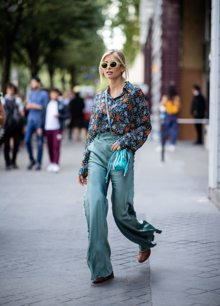 Mintové kalhoty samozřejmě nemusí být jen úzké skinny, ale i rozevláté z lehkého materiálu. Zkombinovat je s květovanou košilí a hnědými chelsea botami pak vůbec není špatný nápad!