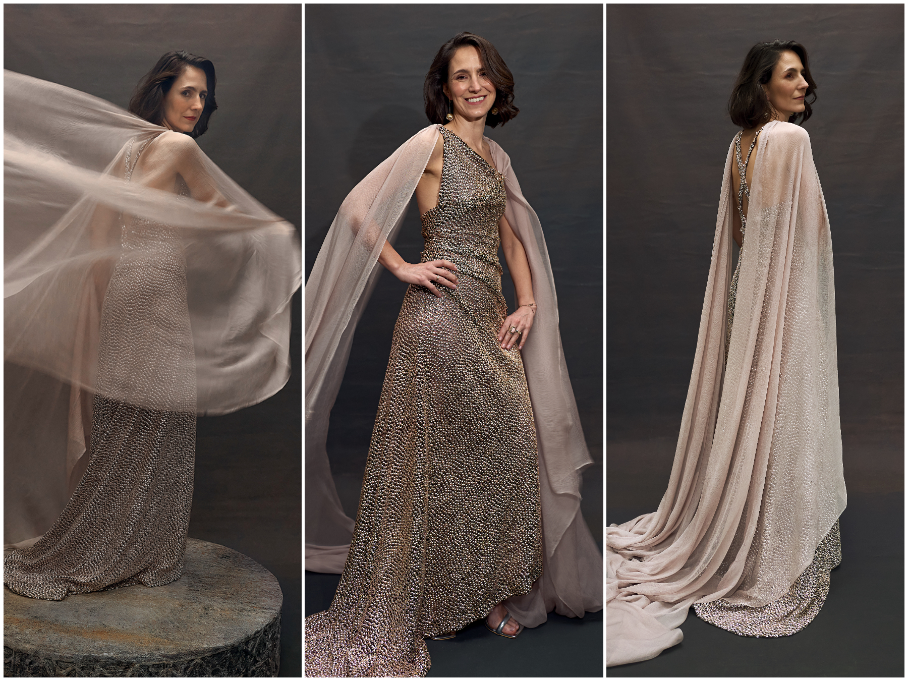 Silueta šatů kopíruje tvar postavy, zároveň ale respektuje pohodlí a volnost pohybu – podobně jako v případě šatů na ceny BAFTA. Liší se však holými zády s překříženými ramínky. Oscarové šaty mají také kryté korzetové šněrování, které pomáhá modelu perfektně sedět na těle,“ dodává návrhářka.