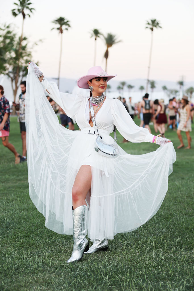 Když bílé šaty, tak se stříbrnými kozačkami a růžovým kloboukem.