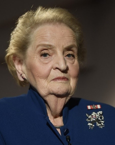 Madeleine Albrightová s broží symbolizující českého lva se slovenským dvojitým křížem promluvila ve Španělském sále Pražského hradu k osobnostem, které přijely na konferenci k 20. výročí vstupu Česka, Maďarska a Polska do NATO. Zdobila ji také při rozhovoru, který poskytla České televizi.