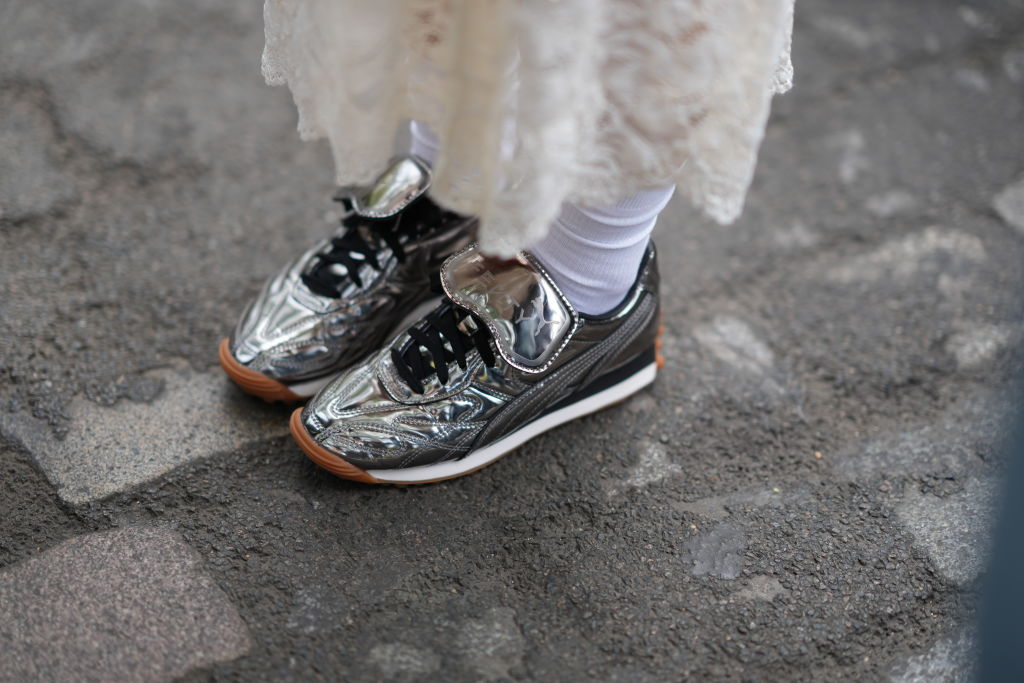 Nahraďte bílé tenisky odvážnějšími. Metalický stříbrný model je trendem jara 2025