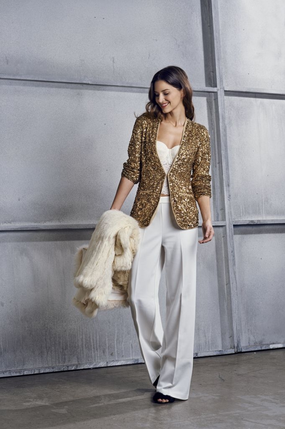 Flitrový blejzr, 20 100 Kč, krajkový korzet 4200 Kč, kalhoty 4300 Kč, kožich z pravé kožešiny 22 700 Kč, boty 8000 Kč. Vše TWINSET