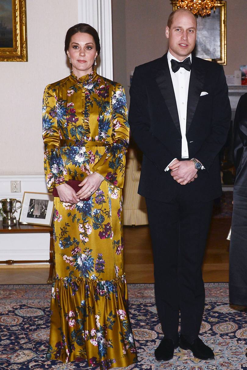 Večeře s dresscodem black tie v sídle britského velvyslance ve Stockholmu ve zlatých květovaných šatech Erdem.