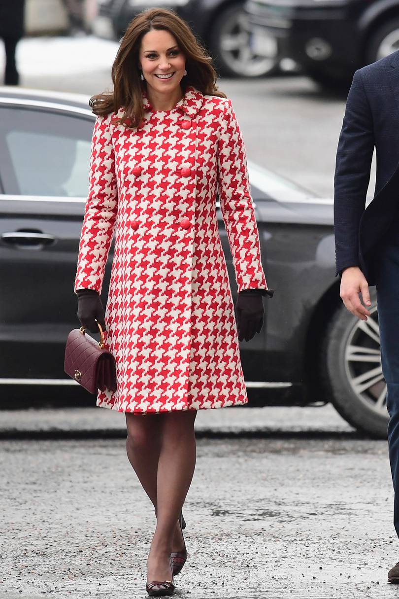 Červenobílý kabát s kohoutí stopou od Catherine Walker nás na Kate velmi mile překvapil.