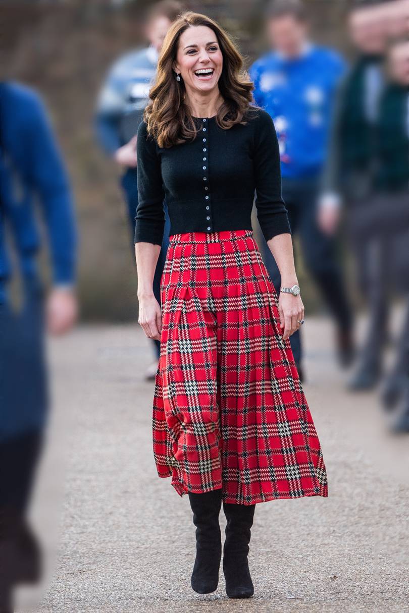 Na Štědrý den ráno vyrazila Kate do kostela St. Mary Magdalene v Londýně v tartanovém kostkovaném kabátě Miu Miu a černé kožešinové čepici.