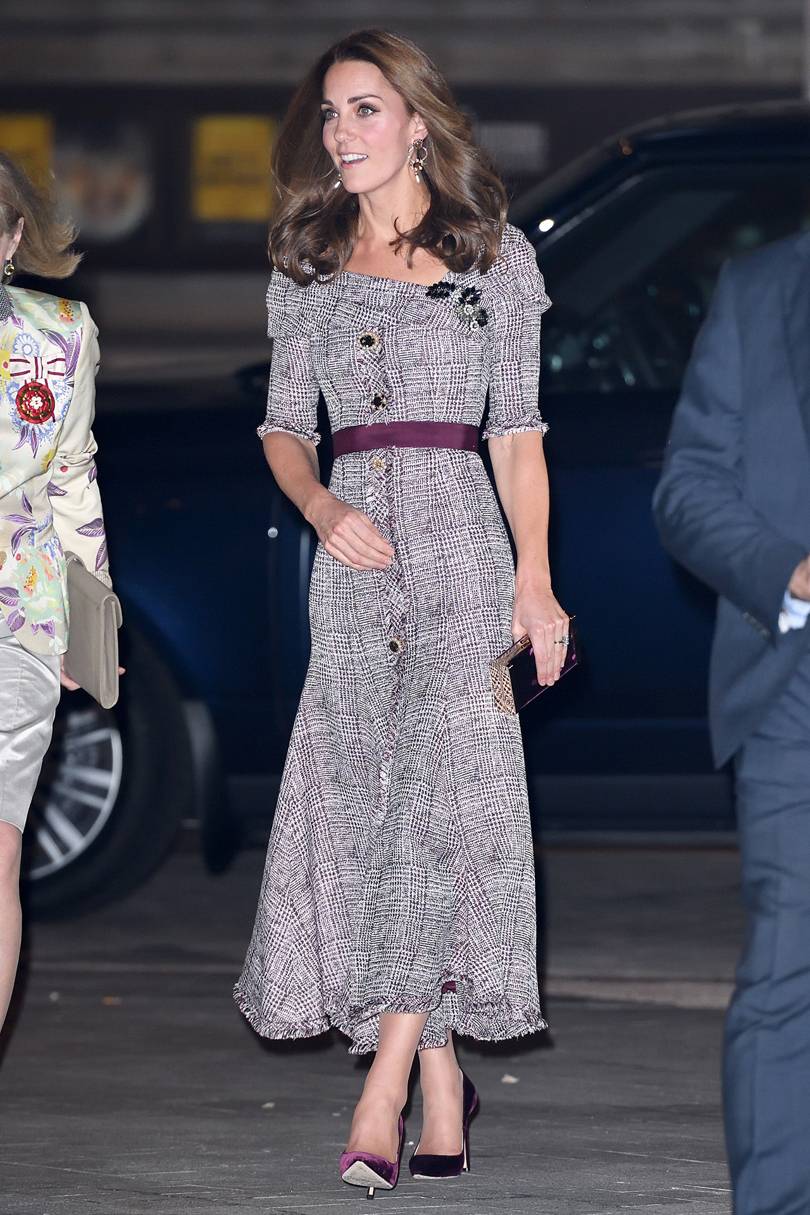Tvídové šaty Erdem doplněné vínovými sametovými lodičkami a psaníčkem od Jimmyho Choo si Kate oblékla do Victoria & Albert muzea v Londýně.