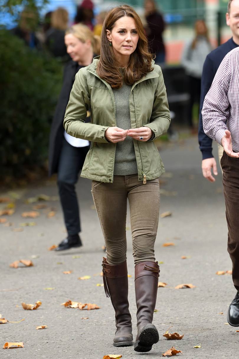 I vévodkyně někdy zvolí úplně běžný styl oblékání. Zde si vzala skinny džíny ze Zary a šedou mikinu v kombinaci s khaki bundou od švédské značky Fjällräven.
