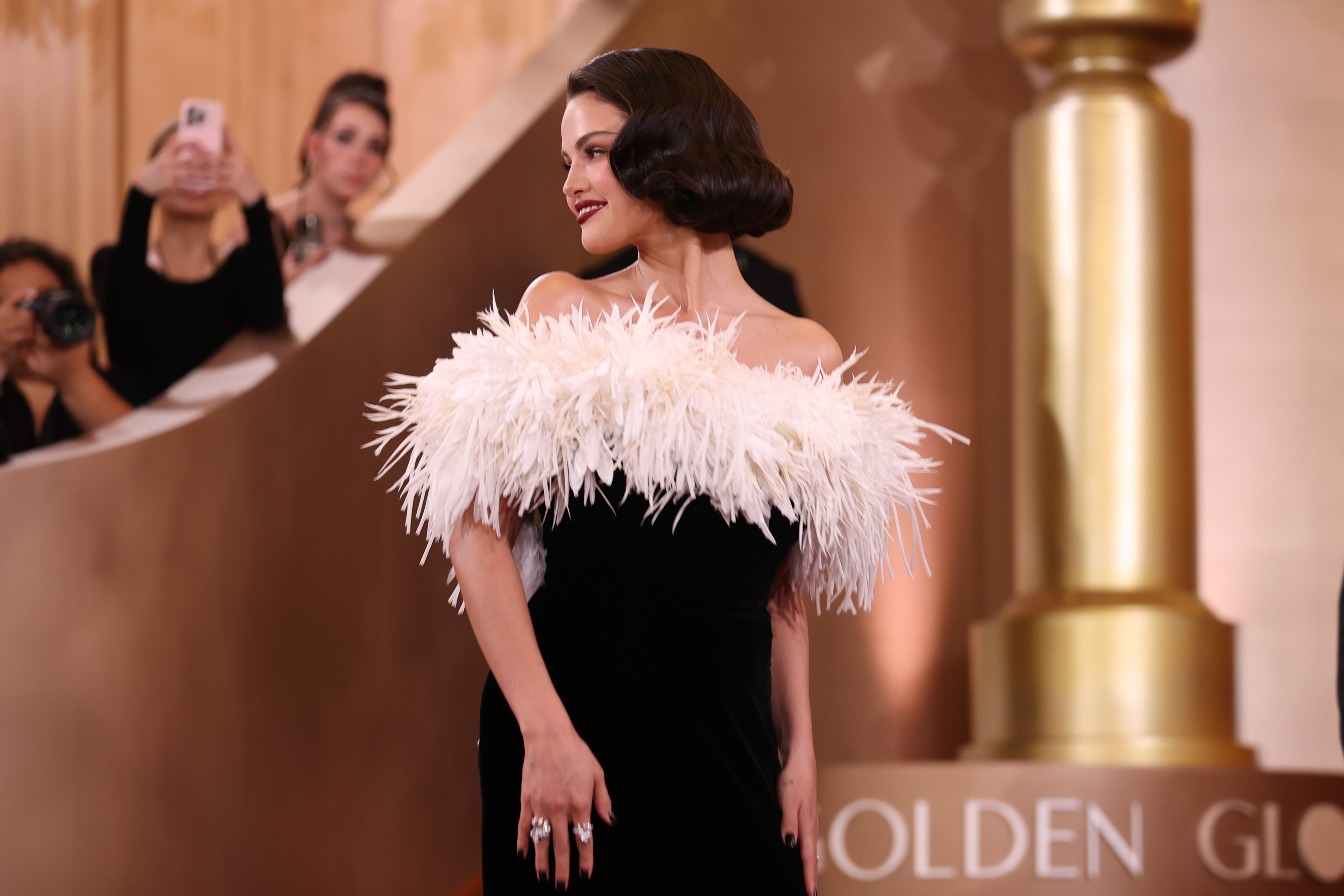 Róba od Armani Privé se třpytila na dálku a díky rafinovaně poskládaným třásním dokonale zdůraznila siluetu – jednoduše šaty snů! Díky bílému „boa“ zaujala také herečka Selena Gomez, která po boku manžela Bennyho Blanca oslnila v černobílé róbě od Chanelu. Obě herečky přenesly svými looky na červený koberec kouzlo starého Hollywoodu.