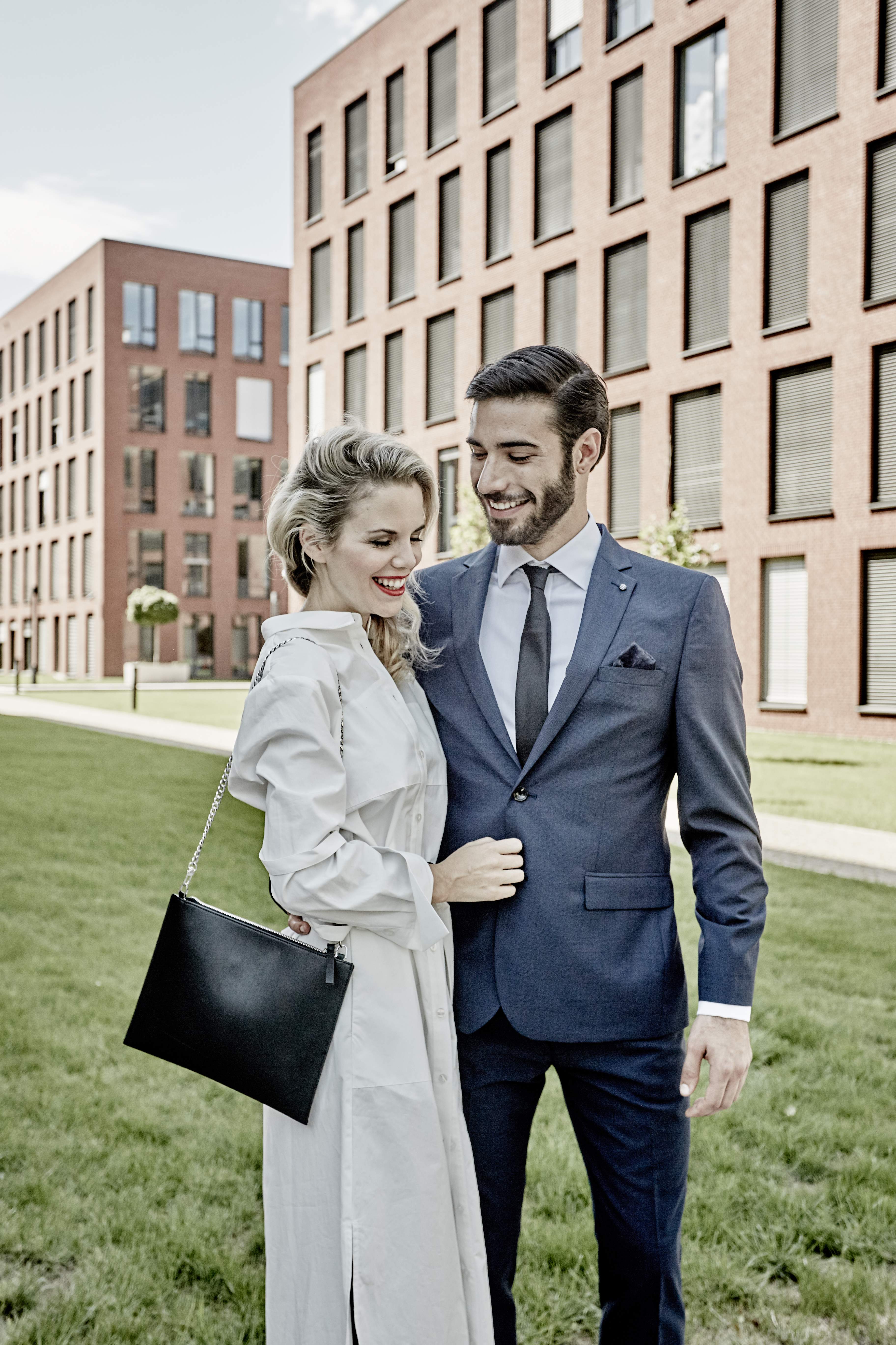 Děti jsme dovedli do školy a vyrážíme do práce. Bílé minimalistické košilové šaty a kvalitní tmavě modrý pánský oblek – ideální outfity na pracovní schůzku, když nechcete nic podcenit.