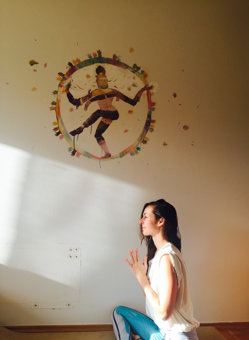 Budík bývá na 6.30. Snažím se pomalu vyplížit se z pod peřiny, abych nevzbudila muže. „Jdeš cvičit?“ ozve se většinou rozespale vedle mě. Má slabé spaní. Ale někdy se nechá navnadit. Dokonce nedávno, než jsem se otočila v koupelně, byl na podložce první. Zapálíme si svíčku a cvičíme v našem obýváku – home yoga studiu před malbou na stěně od malířky Lu Jindrak Skřivánkové. Je na ní rozevlátý tančící Šiva.