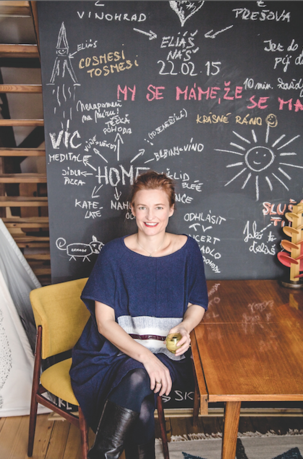 Home. Těžká pohoda. Blbiny & víno. Klid. Kafe. Úklid. Tabule v bytě návrhářky Kateřiny Geislerové a jejího přítele sice primárně funguje jako poznámkový blok na nákupní seznam a úkoly, co se nutně musejí udělat, nechybějí tu ale ani vtipné rodinné vzkazy.