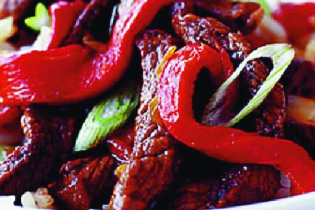 3. Přisypte proužky paprik a všechno opékejte ještě dvě minuty. Pořád promíchávejte. Nakonec jídlo ochutnejte, abyste zjistili, jestli nepotřebuje dosolit (možná to nebude nutné, sójová i vorčesterská omáčka bývají dost slané). Podávejte s rýží, nejlépe v hlubších miskách.