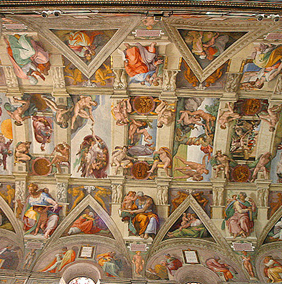 A skutečně při pohledu na nekonečný strop kaple celý pokrytý Michelangelovými freskami s úchvatnými výjevy ze Starého zákona se doslova tají dech. Těžko uvěřit, že většinu čtyři roky trvající práce odvedl mistr sám vleže na lešení v mnohametrové výšce.