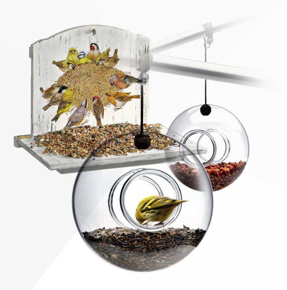 - Krmítko Bird Cafe, Umbra, snímatelný kryt pro doplňování, plast a plexisklo, 20 × 18 × 18 cm, www.homein.cz, 875 Kč