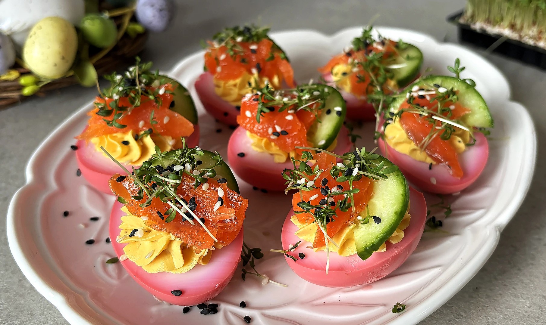 Uvařená vejce oloupeme, dáme do uzavíratelné nádoby a zalijeme řepovým nálevem. Vejce musí být zcela ponořená. Nádobu volíme spíše menší, abychom nemuseli použít velké množství nálevu. Nyní necháme v chladu několik hodin nebo přes noc. Čím déle budou vejce v nálevu, tím výraznější barvu získají. Nicméně barva bílkem prostupuje ke žloutku, ideální jsou přibližně 4 hodiny. Vejce vyndáme a osušíme. Rozkrojíme podélně na půl. Žloutky vyjmeme do misky a rozmačkáme vidličkou. Přidáme scezeného tuňáka, majonézu, hořčici a nasekanou pažitku nebo kopr. Dochutíme solí a pepřem. Bílky dáme na servírovací talíř a naplníme je směsí. Ozdobíme podle chuti, použít můžeme například microgreens a černý sezam.
