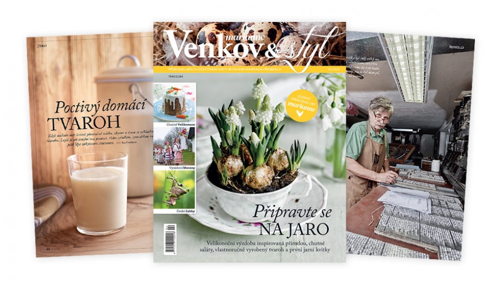 Jaro se sice hlásí dost nesměle, ale zahrádky začínají pomalu rozkvétat, takže se můžeme těšit, že za chvíli tu bude v plné síle. V prvním letošním vydáním Venkova & stylu se definitivně rozloučíte se zimou, potěšíte něžnými květy čemeřice i pochutnáte na křupavých lístcích polníčku a dalších jarních dobrotách. Uvidíte, jak vypadá citlivě zrekonstruovaná roubená chalupa v Jizerských horách a potěšíte se také krásami slováckého Horňácka. Zjistíte, jak se probouzí les, i jak si vytvořit dekoraci z prvních jarních květin nebo ozdobit vajíčka na Velikonoce pomocí dekupáže. Snadno si s námi uděláte poctivý domácí tvaroh a chutné pomazánky z něj. Manželé Krupkovi se věnují knihařskému řemeslu v jeho nejtradičnější, poctivé podobě a my jsme je navštívili a strávili s nimi den v jejich dílně. Prozradíme vám také, proč byste měli ochutnat zelený ječmen nebo pít mléko i jestli umí rosničky předpovídat počasí.