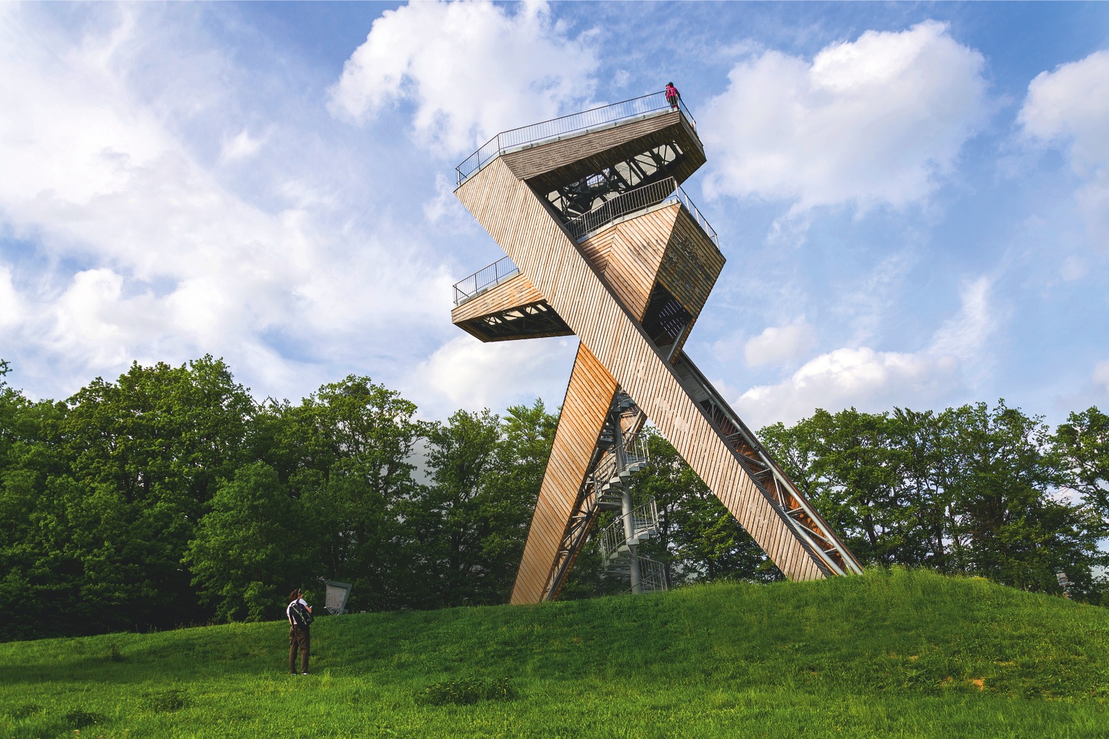 Možná vám tato rozhledna připomíná obří hasák, ve skutečnosti se jedná o dvě sedmičky zaklesnuté do sebe. Každá z nich je jinak vysoká a má svou vlastní vyhlídkovou plošinu. Nižší ze sedmiček nabízí výhled z patnácti metrů, vyšší pak z dvaceti. Stavba, kterou najdete v obci Salaš, jen pár kilometrů od staroslavného Velehradu, je důkazem, že rozhledny nemusejí vznikat pouze na vrcholcích vysokých hor. Leží totiž v Chřibech v nadmořské výšce pouhých 366 metrů. I přesto je z ní nádherný výhled na Bílé Karpaty i dolů na Velehrad. Rozhlednasalas.cz