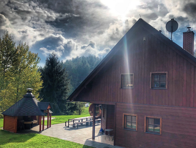 Blízkost malé sjezdovky, vzdálené jen dvě minuty pěší od chaty, je inspirovala k tomu, aby přistavěli lyžárnu. Protože chatu postavil původně holandský manželský pár, rozhodli se Strnadovi zachovat její severoevropský styl. Přidali sudovou saunu a pořídili finskou Kotu, aby v ní mohli grilovat nebo jen tak posedět u ohně hlavně v zimních měsících. Také vytvořili ohniště pro klasické opékání špekáčků. „Vyměnili jsme také venkovní dlažbu, protože byla popraskaná. Nahradili jsme ji tmavou dlažbou a zároveň ji rozšířili,“ doplňuje hrdý majitel Jiří Strnad.