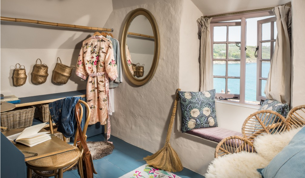 Výrazným prvkem domku se stala modř. Tak od oceánu prostupuje až do samotného interiéu, kde se opakuje na tradičním dřevěném obložení, na výmalbě i některých kouscích nábytku. Tento romantický domek je veskrze malý. V přízemí je kuchyň s útulným obyváčkem, kuchyní i pracovním koutem. O teplo se stará jak podlahové topení, tak veliký krb. Klasický nábytek ve staroanglickém rustikálním stylu, doplňují vintage kousky s prvky glamour. Sametové pohovky, těžké závěsy a zlaté dekorace dodávají starému domku punc luxusu. Máte najednou pocit, že sedíte v koktejlovém salonku. V podkroví je pak ložnice, šatna a koupelna. Jestli hledáte perfektní místo pro napsání knihy, složení básničky, nebo jen potřebujete utéct od všedních starostí, lepší místo jen tak nenajdete.