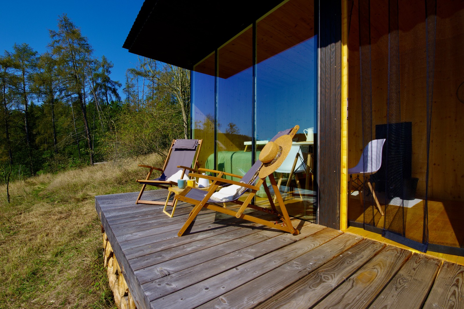 Dvě malé dřevěné chaloupky, sauna a výhledy snů: Projekt nominovaný na Českou cenu za architekturu mění pravidla glampingu