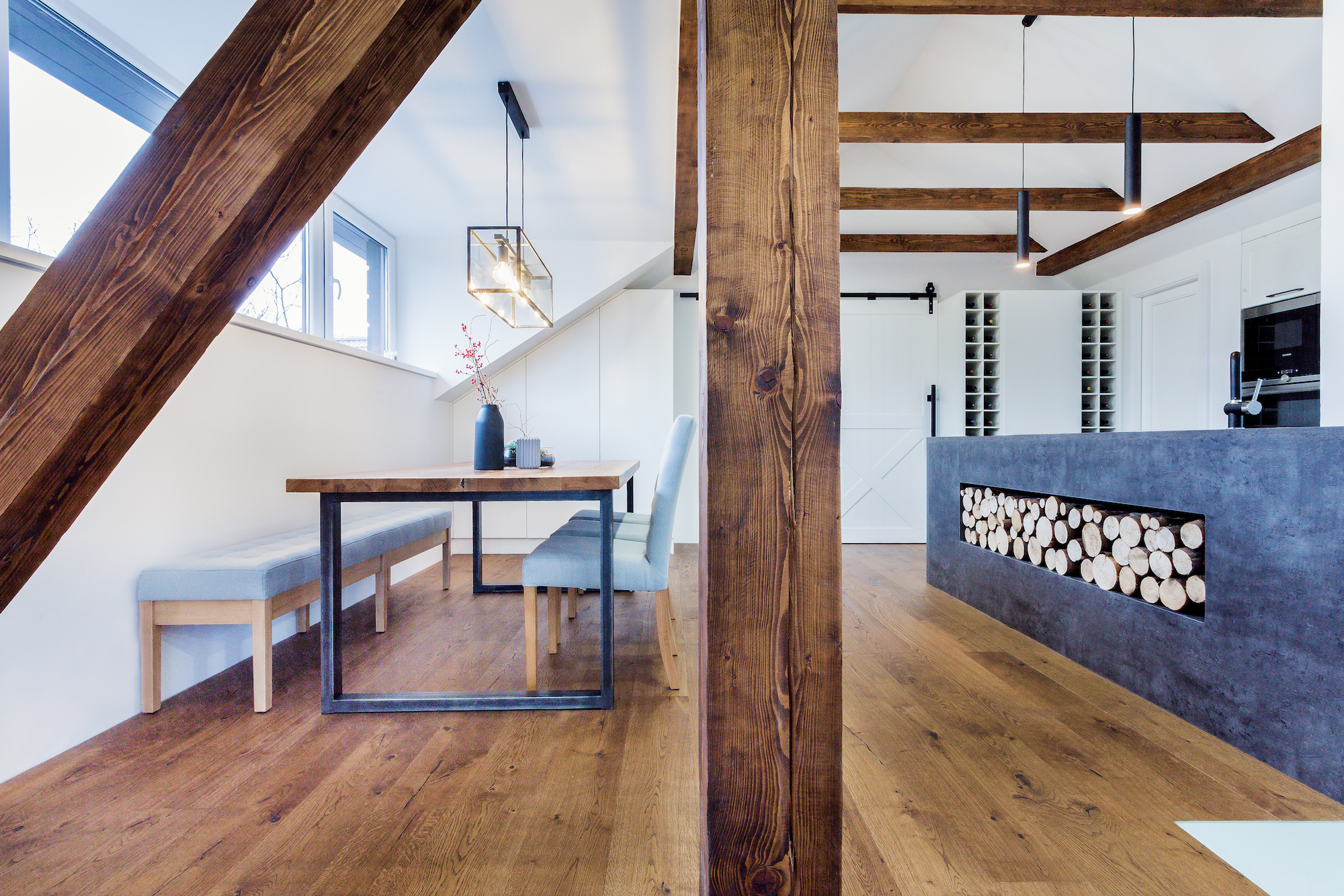Ústředním záměrem rekonstrukce bylo přetvořit půdní prostor na samostatnou podkrovní část domu pro mladou rodinu, která zde nalezla nový domov plný tepla a rodinné pohody. Mladý pár v minulosti strávil několik let v Austrálii a na Novém Zélandu, kde si osvojil lásku ke starým původním věcem, jimž lidé dokáží vdechnout nový život. Jejich společnou největší zálibou je bezesporu cestování. Momentálně však jejich největším štěstí představuje jednoroční dcera Adélka, které věnují maximum svého volného času. „Nechali jsme vyniknout původní krásu rustikálních trámů v kombinaci s nově položenou masivní dubovou podlahou, naolejovanou do stejného odstínu jako trámy. V kontrastu s tímto charakteristickým přírodním prvkem je architektura zdí, ponechaná v čistém bílém puristickém tonu, který jsme se snažili dodržet v celém interiéru. V případě vybavení domu jde o kombinaci skandinávského, industriálního a moderního venkovského stylu, navržených ve vzájemné symbióze takovým způsobem, aby se harmonicky prolínaly. Materiálové zastoupení zde má především přírodní dřevo a kov, doplněné o sklo, keramiku a imitaci betonu.“ Dominantou podkrovního prostoru je prostorná obývací část, propojená s kuchyní a jídelnou. Té vévodí celoplošný prosklený štít, ze kterého je nádherný výhled na tamní podhorskou krajinu. Teplo domova zde navozuje rohový krb, na nějž volně navazuje kuchyňská linka. Z konstrukčního hlediska se jedná o poměrně neobvyklí úkaz, který však má své praktické opodstatnění z pohledu kontinuity, úspory místa a ladného propojení obou částí otevřeného prostoru dohromady.