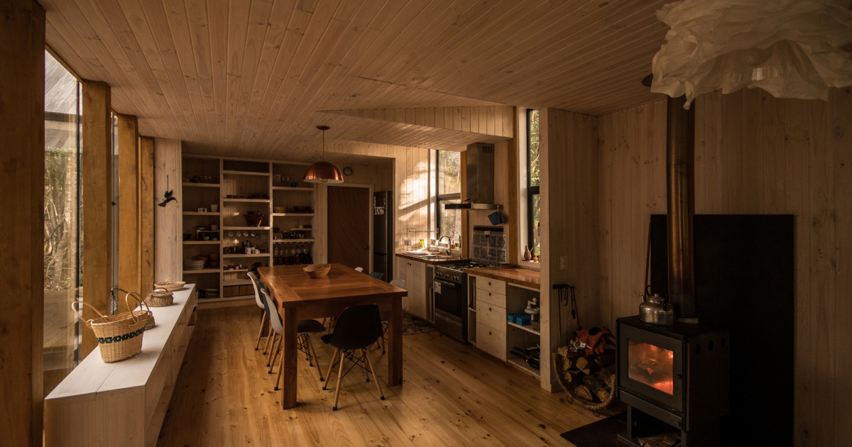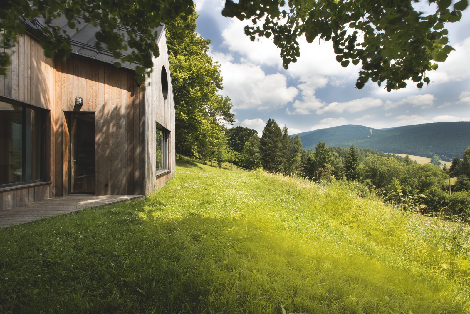 Architekti však neměli na starosti jen budovu samotnou, ale také kompletní návrh interiérů. I uvnitř vládne dřevo různých druhů a v nejrůznějších podobách. Podlahy jsou z dubu, obložení stěn z břízy a vestavěný nábytek z překližky. Středobodem života rodiny je multifunkční společenská místnost v přízemí, do níž přivádí světlo jedno ze zmiňovaných velkých oken. Pozornost každého, kdo se tu ocitne poprvé, upoutá moderní pec, jež slouží nejen k vytápění, ale má i plotnu na vaření a troubu. Jako na každé správné peci, dá se i na téhle také lenošit. „Tohle místo si zamiluje každá návštěva. Naše děti i děti kamarádů si sem rády vylezou a koukají na pohádky,“ popisuje Hanka. Pec samozřejmě nevznikla primárně kvůli dětem, další výrazný prvek interiéru – kruhový otvor ve stropě společenské místnosti – ale ano. Neobvyklé řešení propojilo přízemí s patrem, kde jsou dětské pokoje. Když rodiče potřebují něco svým ratolestem sdělit, nemusí chodit nahoru, volat jim mobilem ani příliš zvyšovat hlas. Otvor kryje pružná síť a je nad ním ukotvena lanová prolézačka ve tvaru pyramidy. Děti nápad architektů ocenily a zmíněný kout domu okamžitě obsadily. Někdy je nahoře živo až moc. To pak musí dospělí otvor zakrýt matracemi. „Jinak bychom dole neslyšeli vlastního slova,“ uzavírá se smíchem Hanka.