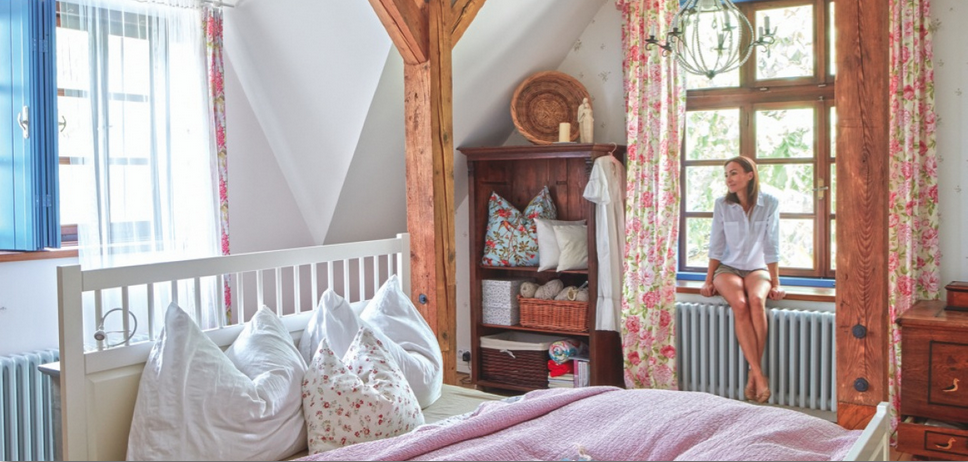 Horní patro už má oproti spodnímu trochu modernější charakter. Kromě přiznaných původních dřevěných trámů je rozčleněné příčkami na ložnici rodičů, ke které přiléhá prostorná koupelna a šatna, klučičí pokoj Danielina staršího syna Nika, ložnici s koupelnou pro hosty, pracovnu pána domu a prostornou halu, kterou jako pracovnu a šicí dílnu využívá hlavně Daniela. Tady se šijí závěsy a další textilní doplňky nejen pro vlastní dům, ale také pro penzion, který manželé společnými silami vybudovali v prostorách bývalé stodoly patřící k hájence nebo pro ty, kteří s Danielou domlouvají zařízení svých domů nebo bytů. Na dosah oken ložnice jsou větve ořešáku a je také skvělou ptačí pozorovatelnou. "Jednou nám sem vletěla sova, usadila se na trámu nad postelí a odmítla jej opustit," směje se Daniela. Bydlení u lesa má prostě svá specifika. Jeden čas tu s nimi bydlel také koloušek, kterého zachránili poté, co se chytil do pytláckého oka nebo že zahradou volně prochází lesní zvěř, která si pochutnává na zelenině ze záhonů.