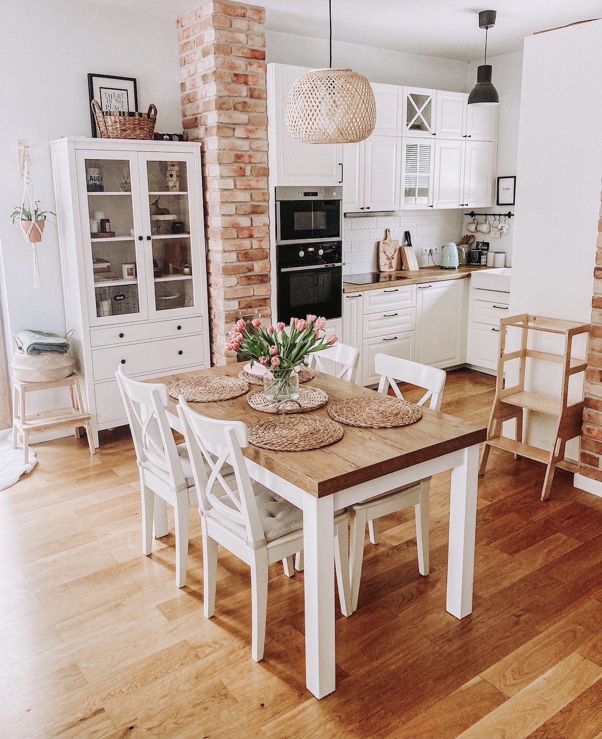 Celková obytná plocha domu je 120 metrů čtverečních. „Většinu nábytku jsme koupili v Ikea. Miluji skandinávský design a styl bydlení. Líbí se mi útulné interiéry, ale tíhnu k minimalismu. Díky jednoduchosti nábytku Ikea se mi podařilo vytvořit efekt teplého interiéru, ale ne přeplácaného. Kombinovali jsme bílý nábytek s dřevěnými nábytkovými deskami a přírodními materiály. Občas vidíte odhalenou cihlovou zeď, nechybí zde dřevěná podlaha, ale v interiéru máme i betonové dlaždice,“ popisuje Kasia. Oblíbila jsem si přírodní dekorace a hledám je obvykle v online obchodech, ale také podporuji místní tvůrce. Ráda navštěvuji bleší trhy, nebo pořizuji věci z druhé ruky. Zásadní pro mě je používat různé textury tkanin. A obecně u nás doma platí čím méně plastu, tím lépe. Útulnost je pro mě na prvním místě.“