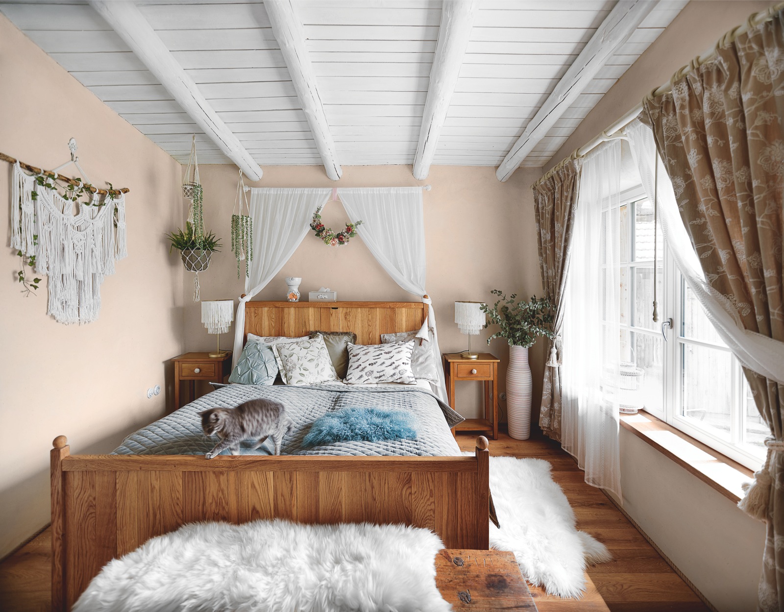 „Když jsme to tu zařizovali, měla jsem záchvat, že všude, kam to jde, musíme instalovat nějaké úložné prostory. Tak jsem s truhlářem vymyslela výklopné čelo postele, dají se do něj uložit třeba povlaky na polštáře nebo přehozy. Jeho horní část slouží jako polička na různé dekorace a na ni hezky navazují jemná nebesa. Čelo je vysoké tak akorát, abychom večer, když si tu čteme knížky, neshazovali věci hlavou,“ usmívá se Alice. „Během celé proměny nám společnost dělaly kočky Bali a Money. A zdá se, že i jim se ložnice více než líbí! Interiér je teď lehounce romantický, a přitom pocitově velmi vzdušný. Největší revoluci tu udělala nebesa,“ říká interiérová designérka Denisa Bartošová. Ložnice působí jako tajná komnata. Velká skříň z olšového dřeva nahrazuje celou jednu stěnu, přičemž ani z ložnice, ani z druhé strany na první pohled nepoznáte, kde je vchod. Tvoří ho totiž jedny ze skříňových dvířek. „Já jsem se do procesu dostala, když bylo potřeba vyřešit okna, upravit půdorys a vybrat nádherné hliněné omítky vyráběné na zakázku. Protože nosný skelet stavby tvoří dvanáct masivních trámů, nemohli jsme moc hýbat dispozicemi, celý dům by spadl. Konkrétně v ložnici jsme nakonec zvětšili okno, zbourali příčku oddělující vedlejší místnost a místo ní vestavěli oboustrannou skříň s neviditelnými dveřmi. Její instalace trvala tři dny. Klobouk dolů před Alicí a truhláři,“ uzavírá designérka.