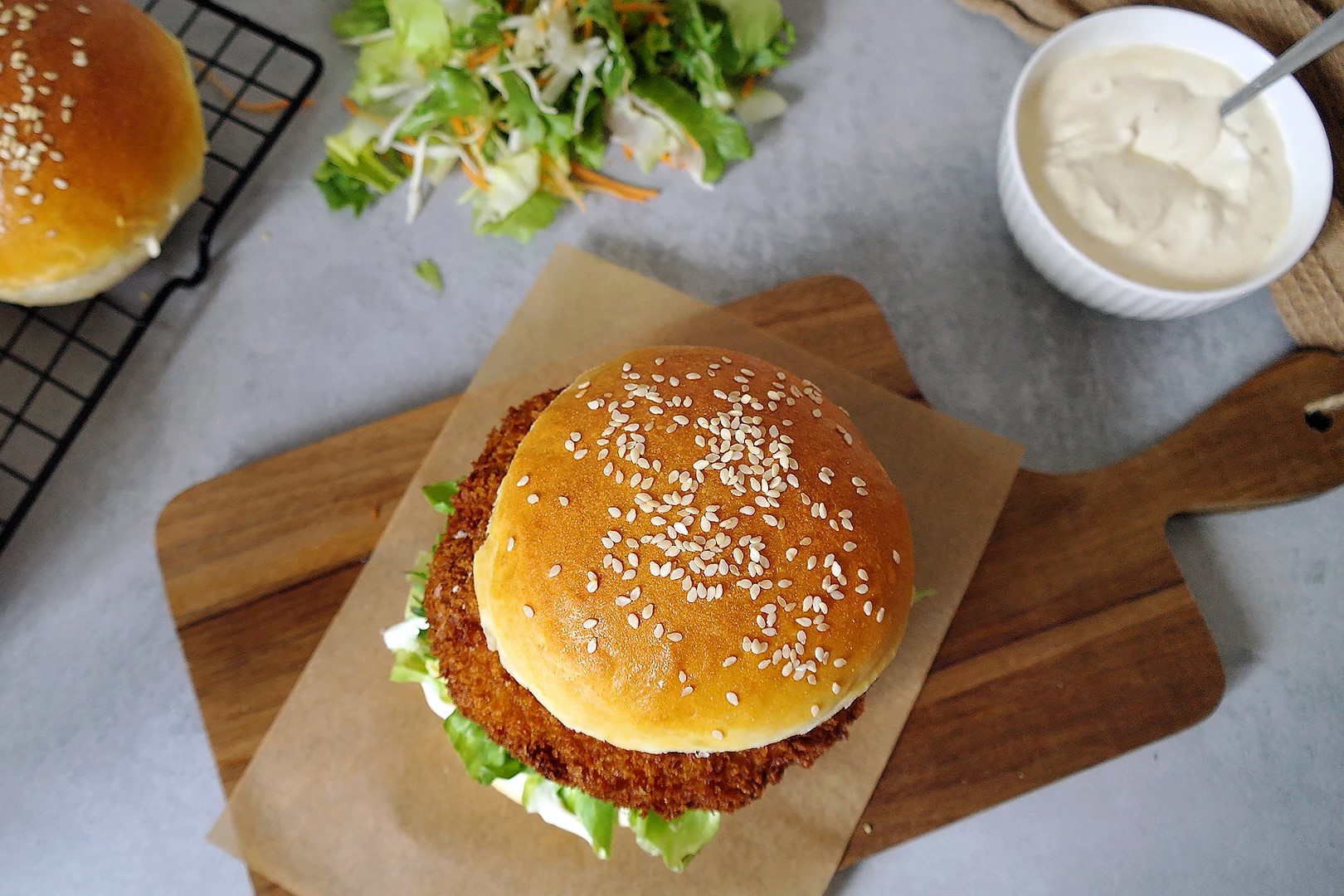 V míse smícháme mleté kuřecí maso s vejcem, sušeným česnekem, hořčicí, solí a pepřem. Důkladně promícháme. Z hmoty vytvarujeme 8 placiček a uložíme je na tác vyložený pečicím papírem. Dáme na 30 minut do mrazáku, aby ztuhly a lépe držely tvar. Mezitím připravíme těstíčko: smícháme mouku, mléko a vejce do hladké, hustší konzistence. V malé misce smícháme všechny suroviny na omáčku a dochutíme podle potřeby. Ztuhlé placičky obalíme nejprve v těstíčku a poté v panko strouhance. Smažíme ve vyšší vrstvě oleje na středně nízkém plameni dozlatova, dokud nejsou křupavé a dobře propečené. Na rozkrojenou briošku naneseme omáčku, přidáme salát, usmaženou kuřecí placku a přiklopíme druhou částí bulky.