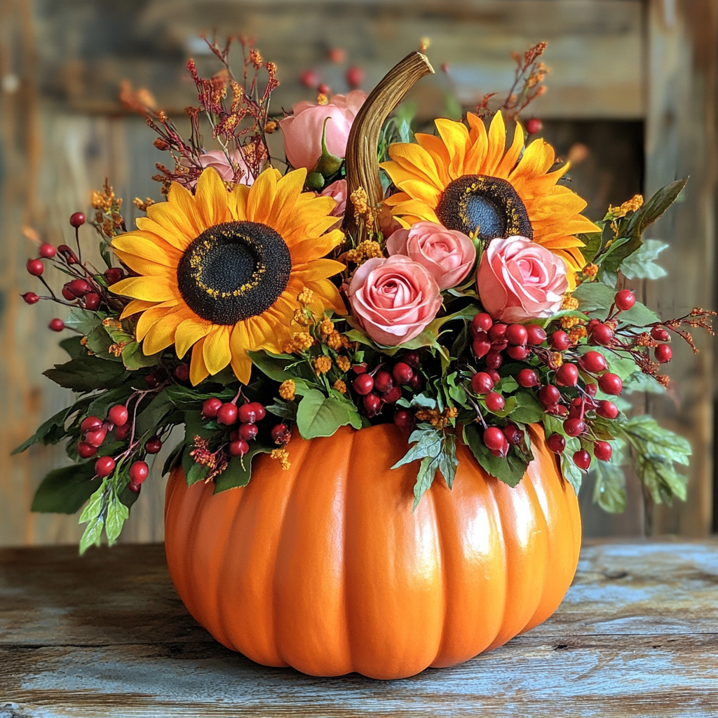 Vyberte si dýni o průměru kolem 20 cm, která bude dostatečně široká, aby poskytla prostor pro vázu s květinami, a zároveň nebyla příliš těžká. Opatrně odřízněte její vršek ostrým nožem a vytvořte otvor dostatečně velký na vložení nádoby. Poté lžící nebo naběračkou vydlabejte vnitřek dýně a odstraňte semínka a dužinu. Do vydlabané dýně vložte sklenici nebo menší nádobu, která udrží vodu a květiny déle čerstvé. Pro aranžování použijte sezónní květiny, jako jsou chryzantémy, slunečnice nebo astry, a doplňte je větvičkami s bobulemi, okrasnými trávami, šiškami či sušeným listím. Pokud máte rádi sušené květiny, i ty mohou být skvělou volbou pro tuto podzimní vázu. Kreativní duše mohou dýni ozdobit barvami či malovanými vzory. Hotovou dýňovou vázu umístěte na stůl, verandu nebo ke vchodovým dveřím.
