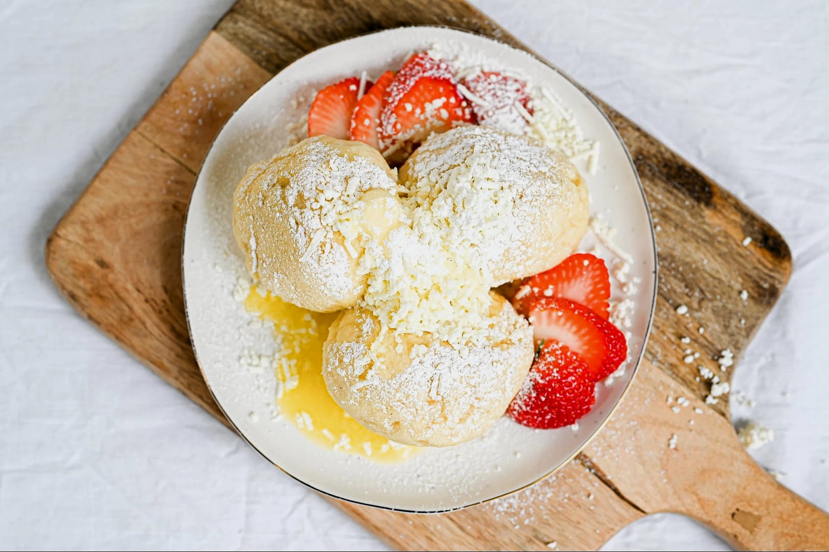Droždí zasypeme cukrem, zalijeme částí vlažného mléka a necháme vzejít kvásek. Ve zbytku vlažného mléka rozmícháme žloutek. Do mouky vmícháme špetku soli a následně i kvásek. Poté mléko se žloutkem a rozpuštěné, ale vlahé máslo. Vypracujeme hladké těsto a necháme v teple vykynout. Po vykynutí vyválíme váleček a ukrajujeme kousky. Do těch balíme zvolené kousky ovoce. Opět necháme vykynout. Knedlíky vložíme do vařící vody a vaříme je asi 4-6 minut. Tento čas je orientační, záleží na velikosti knedlíků. Knedlíky v průběhu vaření vyplavou, potom je otočíme. Vyndáme je děrovanou naběračkou a propícháme, aby unikla pára. Podáváme se strouhaným tvrdým tvarohem, cukrem a polité rozpuštěným máslem nebo s posypkou podle své volby či druhu ovoce.