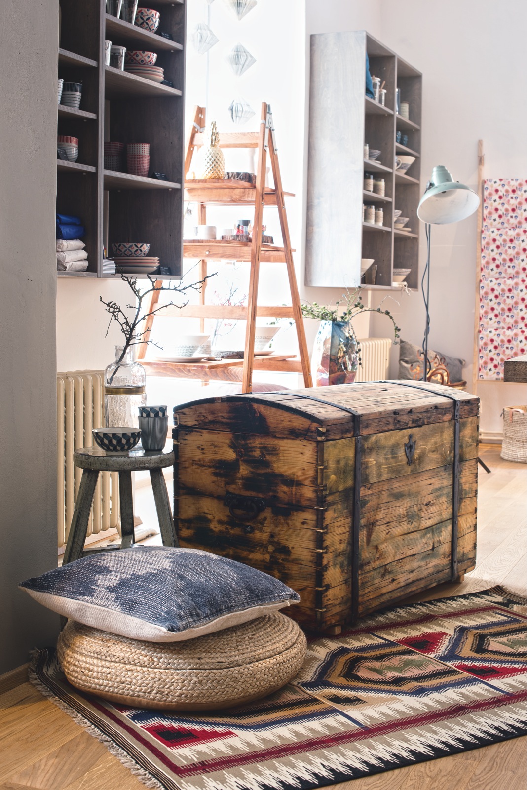 5. Víko truhly zajistěte proti převrácení z každé strany koženými šňůrkami upevněnými v očkách z vnitřní strany boků truhly a víka. Rošt z nových prken pak překryjte vlněným plédem, poklaďte měkkými polštáři, kterými můžete vyložit i víko, otevřete si knihu – klidně o kutění, a vychutnávejte si zasloužené dílo i odpočinek.