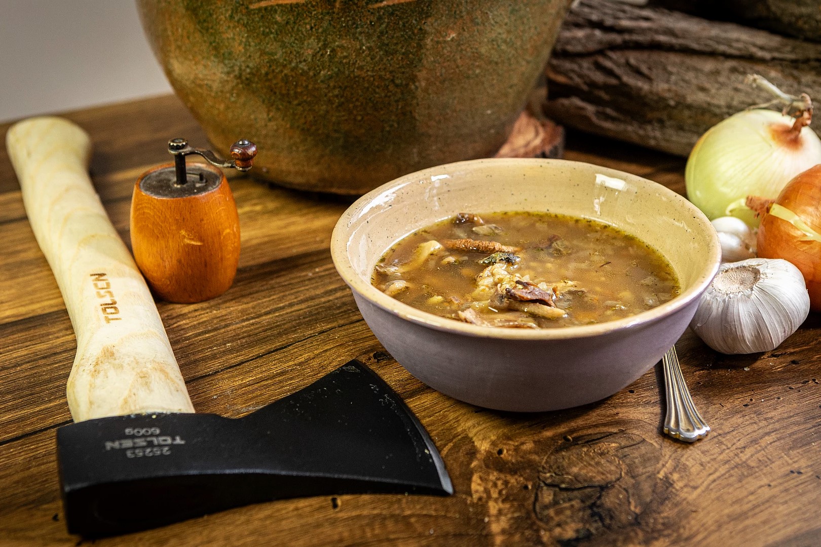 V pohádce je to nějak takto: Sekyra se vaří ve vodě a vznikne výborná a silná polévka. Opravdu jen ze sekyry! Jen to chce ještě hrst krup, hrst sušených hub, trochu omastku a zápražku. Tenhle pohádkový trik je v různých verzích známý v mnoha zemích a napříč různými kulturami. Objevuje se kamenná polévka, polévky z knoflíků, hřebíků, šroubů nebo ze dřeva, ale například i sekyrková kaše. I recepty na zbylé ingredience se liší. Hlavní myšlenka ale zůstává vždycky stejná: přelstít lakomého boháče tak, aby se i chudák najedl. Lakomec ze zvědavosti nechá chudáka vařit polévku ze sekyry a ochotně přináší ze svých zásob různé přísady – od brambor až po maso, aby byla polévka ještě chutnější. A dokonce je překvapený výsledkem a nadšený, jaká je ta polévka „zadarmo“ výborná.