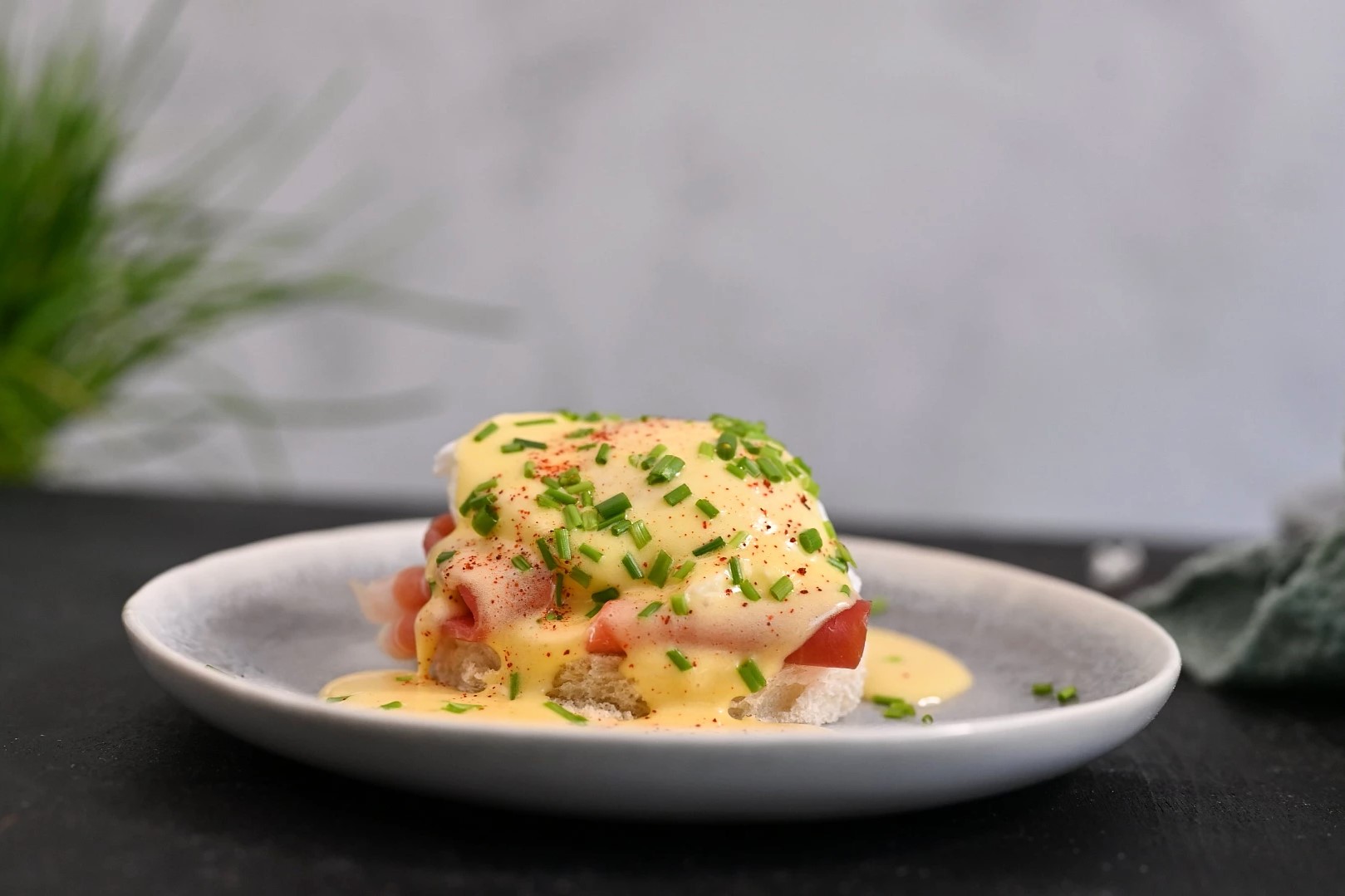 V nejčastěji uznávané verzi vytvořil vejce Benedikt vrchní číšník hotelu Waldorf Astoria v New Yorku. Podle článku v deníku The New Yorker z roku 1894 vešel do jídelny hotelu Waldorf na snídani zákazník jménem Lemuel Benedict. Hledal lék na kocovinu a objednal si čtyři ingredience: máslový toast, křupavou slaninu, dvě ztracená vejce a holandskou omáčku. Místo odděleného servírování tehdejší slavný vrchní číšník hotelu Oscar Tschirky nahradil toast anglickým muffinem a zbytek ingrediencí navršil nahoru. Další příběh o původu vejce Benedikt sahá až do šedesátých let 19. století. Tato legenda říká, že častá zákaznice restaurace Delmonico, manželka finančníka z Wall Street Legranda Benedicta, začala být unavená ze stálého menu. Přála si něco nového a mluvila o tom s Charlesem Ranhoferem, věhlasným šéfkuchařem z tohoto podniku. Ranhofer pro ni vytvořil „vejce Benedikt“. Jeho nově vymyšlený recept vyšel v kuchařce nazvané Epicurean (Požitkář) v roce 1893. Za vynálezce receptu ovšem bývá někdy označován také komodor Elias Cornelius Benedict, případně se pojmenování odvozuje od benediktinských mnichů.