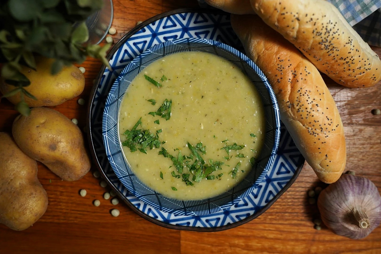 Z kostí začneme vařit vývar v osolené vodě, z vývaru sbíráme průběžně pěnu. Později přidáme celý pepř, očištěnou kořenovou zeleninu a cibuli a vaříme do měkka. Hotový vývar procedíme. Hrách, který musíme nejlépe den předem namočit, slijeme z této vody, dáme vodu čerstvou, a také uvaříme do měkka. Prolisujeme nebo rozmixujeme. Z části sádla a z mouky připravíme jíšku a za neustálého míchání šlehací metlou přilijeme vývar z kostí a vaříme. Po 30 minutách přidáme prolisovaný hrách, mletý pepř a dále zvolna vaříme. Ke konci varu přidáme rozetřený česnek a drcenou majoránkou. Můžeme přidat i trošku polévkového koření, ale není ani třeba. Podáváme s osmaženým rohlíkem nebo žemlí a ozdobíme petrželkou.