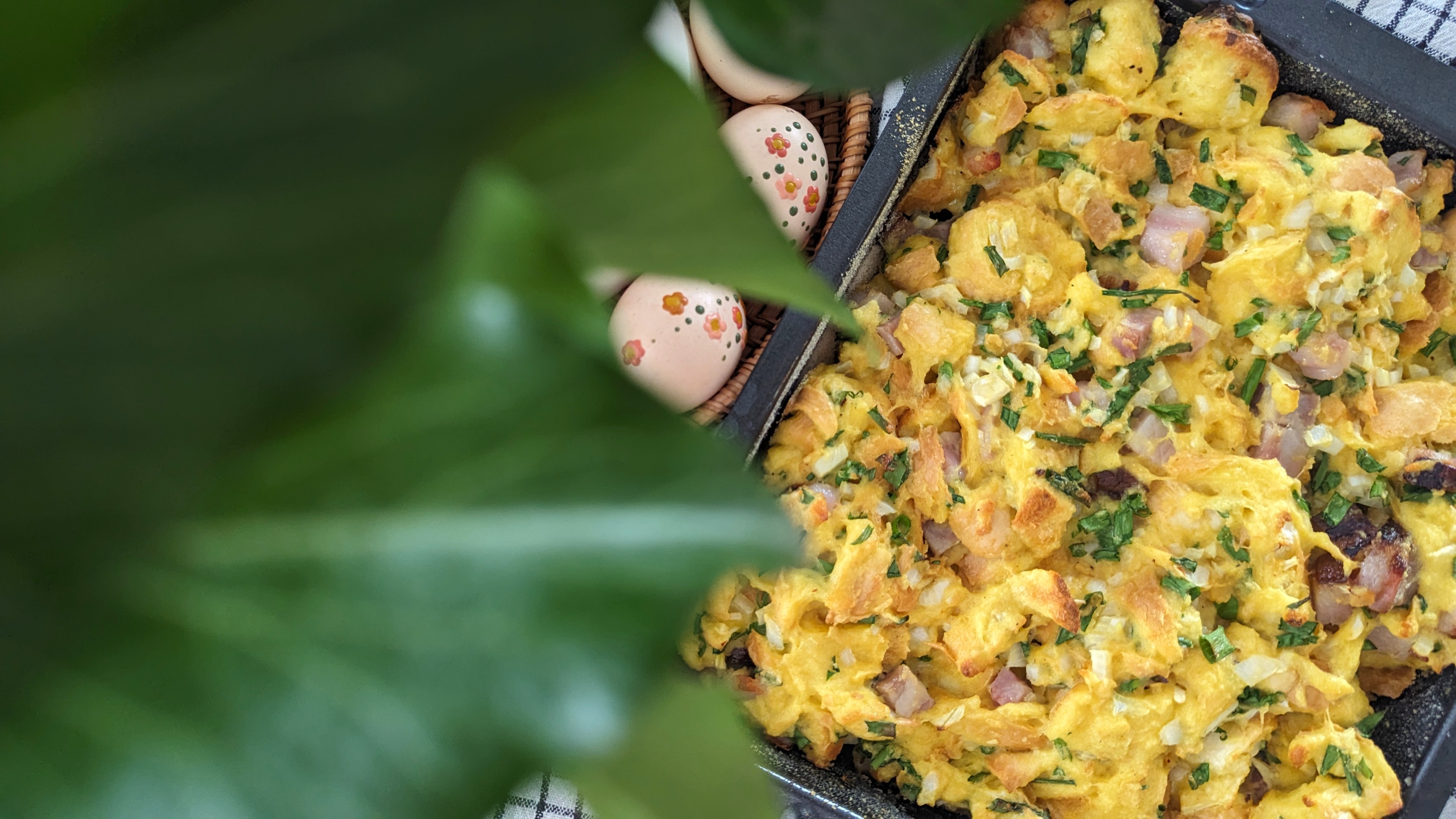 U tohoto receptu se nešlehá sníh z bílků, a tak pokud barvíte vyfouknutá vajíčka, použijte jejich obsah právě do velikonoční nádivky. Stejně tak využijete starší rohlíky, takže se nevyhodí, a zeleň najdete venku. Už totiž rostou mladé kopřivy, nebo se vám možná na zahrádce zelená pažitka, případně bylinky samozřejmě také koupíte v obchodě.