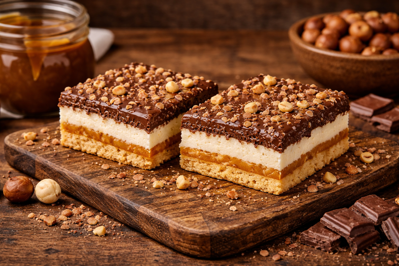 Plátkovou želatinu namočíme do horké vody a necháme rozpustit. Necháme krátce zchladnout, aby nebyla vařící. Mascarpone smícháme s cukrem. Smetanu ke šlehání vyšleháme dotuha a opatrně ji zapracujeme do mascarpone. Za stálého míchání tenkým proudem přilijeme rozpuštěnou želatinu a krém důkladně, ale jemně promícháme. Karamelové Salko ohřejeme a rozmícháme s mlékem do hladké, roztíratelné konzistence. Na dno formy o velikosti cca 20 × 30 cm vyskládáme vrstvu máslových sušenek. Naneseme polovinu krému, uhladíme a dáme druhou vrstvu sušenek. Rozetřeme karamelovou vrstvu. Vyskládáme třetí vrstvu sušenek, naneseme zbytek krému, uhladíme a dáme do lednice. Mezitím připravíme polevu. Smetanu ohřejeme a přelijeme čokoládu. Necháme 2–3 minut odstát, důkladně rozmícháme a přidáme ořechy. Nalijeme na povrch dezertu. Hotové řezy uložíme do lednice a necháme alespoň 4 hodiny ztuhnout (ideálně přes noc). Po vychlazení nakrájíme ostrým nožem na řezy.