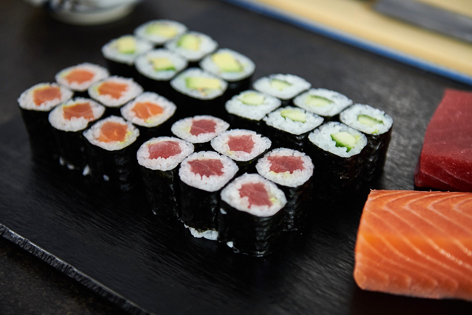 Filety z lososa a tuňáka nakrájíme na tenké proužky o hmotnosti à 40–55 g. Práškové wasabi promícháme se studenou vodou do konzistence pasty a necháme 10–15 minut odpočinout v pokojové teplotě. Plát řasy nori rozpůlíme. Jednu polovinu položíme na podložku hladkou stranou dolů. Na ni rozprostřeme 75 g rýže, horní pětina plochy řasy zůstane prázdná. Na střed řasy rozetřeme proužek wasabi a na něj položíme dva pruhy ryby. Podložku nadzvedneme a řasu přehneme. Tím spojíme její spodní okraj s horním. Rýži i maso přidržujeme uvnitř pomocí prstů. Rolku nakonec utáhneme, zpevníme a dotvarujeme do finální podoby. Avokádo rozpůlíme, odstraníme pecku, a avokádo nakrájíme na cca 1 cm plátky. Rýži opět rozprostřeme po řase, přidáme wasabi (pokud připravujeme sushi pro děti, wasabi vynecháme) a také sezam. Avokádo umístíme doprostřed a zarolujeme. Zpevníme a zformujeme. Poslední rolka bude s okurkou. Okurku nakrájíme na tenké hranolky. Rýži opět rozprostřeme po řase, přidáme wasabi (pokud připravujeme sushi pro děti, wasabi vynecháme). Nakrájenou okurku umístíme doprostřed, po stranách rolky ji seřízneme a zarolujeme. Zpevníme, zformujeme a máme hotovo. Namočeným nožem rolku rozkrojíme napůl a pak každou polovinu na třetiny.