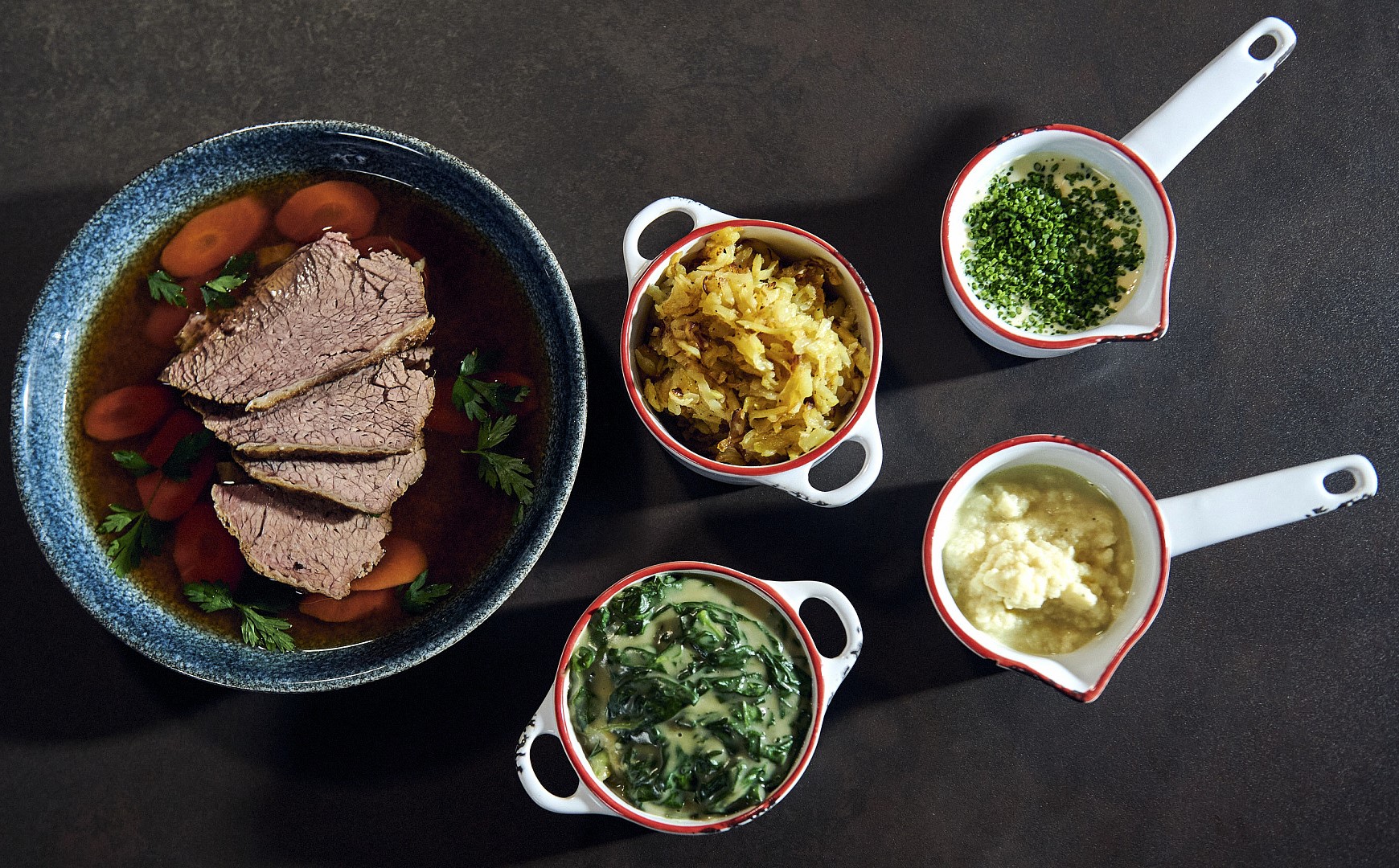 Zeleninu očistíme a nakrájíme na větší kusy. Do hrnce dáme studenou vodu, pořádně ji osolíme a následně do vody vložíme nasolené maso a zeleninu s petrželkou. Vývar přivedeme k varu.Z vývaru, který začal probublávat, sesbíráme vysráženou pěnu. V tomto momentu vývar okořeníme pepřem, novým kořením a bobkovým listem. Vývar táhneme pod bodem varu asi 5 hodin. Zatímco se vývar vaří, připravíme pažitkovou omáčku, jablečný křen a zadělávaný špenát. V menším rendlíku dáme vařit vodu na spaření jablek. Jablka zatím oloupeme, odstraníme z nich jádřince a nakrájíme je na silnější měsíčky. Na pažitkovou omáčku nejprve nakrájíme toustový chleba na kostičky. Ten vložíme do vyšší nádoby, přidáme k němu dvě uvařená a oloupaná vejce, dva syrové žloutky, větší špetku cukru, půl lžíce dijonské hořčice a asi lžičku jablečného octa. Osolíme a přilijeme asi 50 ml mléka a 100 ml vývaru. Ponorným mixérem mixujeme dohladka a postupně a pomalu přiléváme slunečnicový olej, dokud nedosáhneme dokonalé emulze. Připravíme jablečný křen. Nakrájená jablka vložíme do vroucí vody. Do vyšší nádoby dáme asi hrst čerstvě nastrouhaného křenu, osolíme a opepříme, přidáme jablečný ocet, olej a vlažný vývar. Ke směsi přidáme také změklá jablka a vše rozmixujeme dohladka. Obě omáčky uložíme do chladu. Na zadělávaný špenát nejprve nasekáme očištěný česnek na plátky a špenátové listy omyjeme a odstraníme z nich dřevnaté stonky. V rendlíku rozehřejeme máslo, na kterém zpěníme a rozvoníme nasekaný česnek. Jakmile máslo pění, přidáme do něj dvě lžíce mouky a důkladně ji zarestujeme. Zalijeme ji vývarem. Podle potřeby ještě naředíme dalším vývarem. Vznikne nám základní velouté. Při mírné teplotě a za občasného promíchání dál provařujeme. Připravíme restované brambory z předvařených brambor, které je nejlepší předvařit ve slupce a ne zcela doměkka, den dopředu, aby se vypařila vlhkost a dobře se restovaly. Do pánve dáme máslo a rozehřejeme jej. Na něj vložíme nastrouhané brambory, osolíme, opepříme a pomalu restujeme. Občas promícháme a brambory necháme restovat na středním výkonu (plameni). Do předpřipraveného velouté přidáme špenát a necháme jej zavadnout. Zlehka promícháme. Po uvaření vývaru a přichystání si všech dalších komponentů můžeme začít servírovat. Do mističky (hrnečku) nachystáme restované brambory, do další mističky (hrnečku) nalijeme pažitkovou omáčku, kterou až teď posypeme drobně krájenou pažitkou. Třetí mistička (hrneček) bude naplněna krémovým špenátem. Do poslední mističky dáme jablečný křen. Květovou špičku nakrájíme přes vlákno na plátky a vložíme do talíře s horkým vývarem a nakrájenou zeleninou.