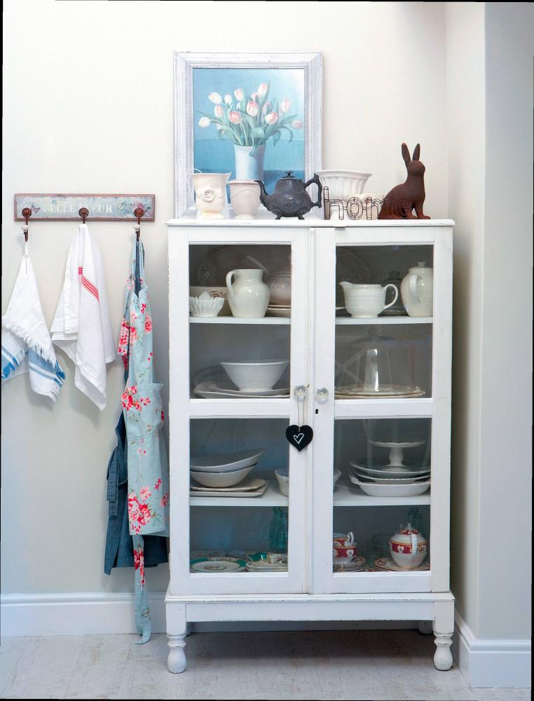 K bílému základu a dřevěným motivům přidejte barevné akcenty. Když se soustředíte na stylové doplňky – džbánky, plecháčky, utěrky a podobně, určitě objevíte spoustu vzorů, které vaši kuchyň spolehlivě rozveselí. Stará dřevěná polička, která nyní bude sloužit k praktickým i dekorativním účelům, se může stát nejatraktivnějším prvkem vaší kuchyně.