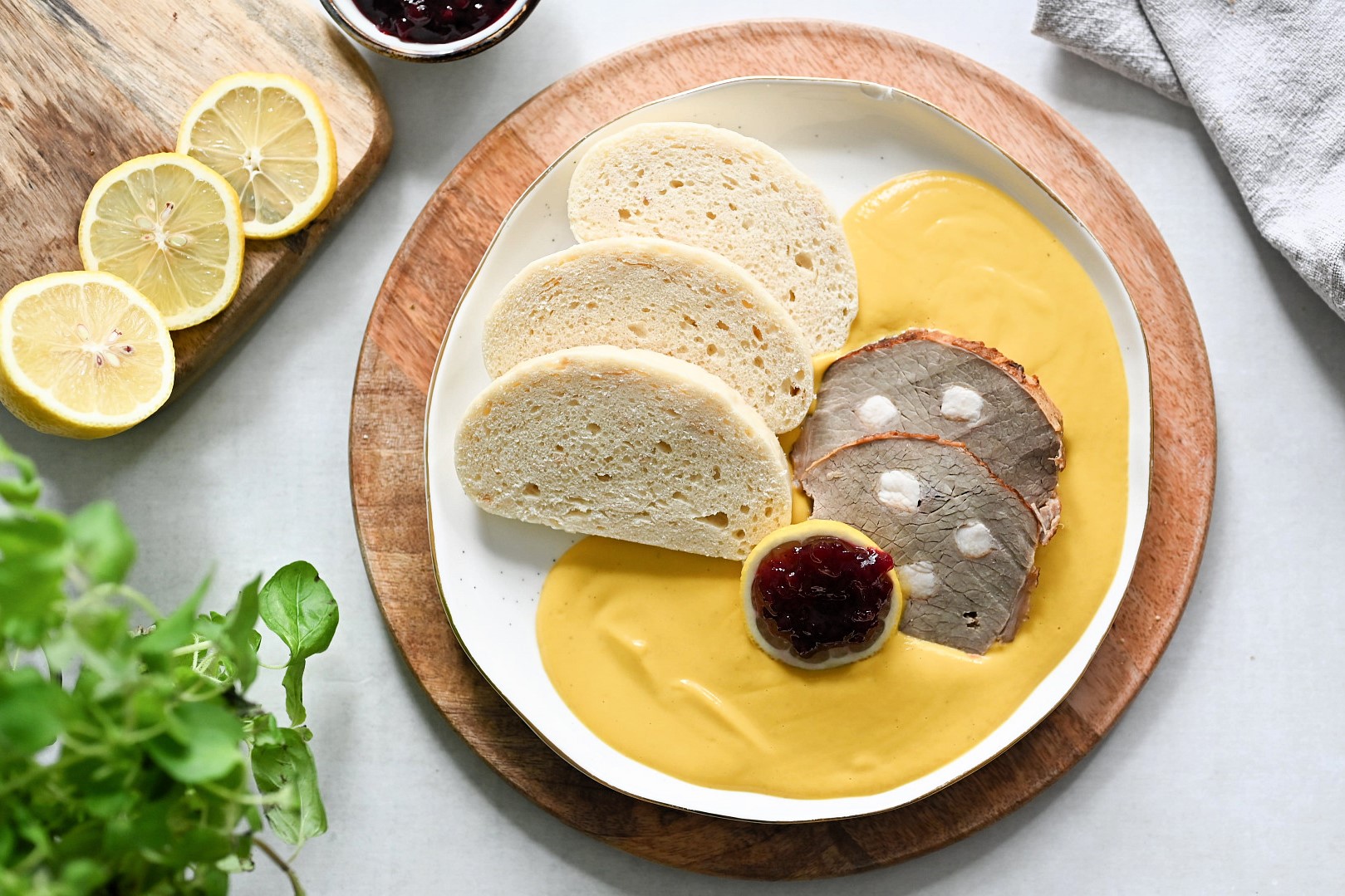 Maso prošpikujeme hranolky slaniny (jde to skvěle, pokud ji dáme na půl hodiny do mrazničky), osolíme a opečeme na oleji, nebo na oleji s máslem (máslo se nebude připalovat). Poté maso vyjmeme a na výpeku opečeme nahrubo nastrouhanou zeleninu a cibuli. Jakmile mrkev pustí barvu, přidáme cukr a necháme zkaramelizovat. Přidáme hořčici, koření, přilijeme ocet, vložíme maso a zalijeme vroucím vývarem. Hrnec či pekáč přikryjeme poklicí a vložíme do trouby předehřáté na 160 °C a pečeme do změknutí masa (přibližně 1,5-2 hodiny). Poté maso i koření vyjmeme, maso nakrájíme a omáčku rozmixujeme. Je-li třeba, zahustíme omáčku hladkou moukou, rozkvedlanou v mléce a provaříme (mouku je třeba provařit minimálně po dobu 20 minut), podle potřeby dosolíme. Omáčku zjemníme smetanou, dochutíme citronem, plátkem másla a dále již nevaříme. Podáváme s houskovým knedlíkem, na talíři dozdobíme kouskem citronu a brusinkami.