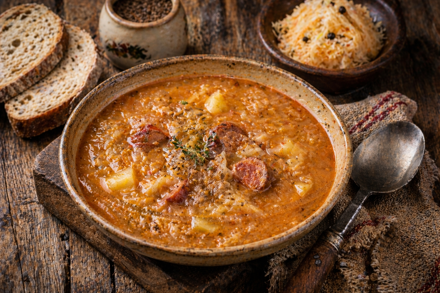 Cibuli oloupeme a nakrájíme na drobno. V hrnci rozehřejeme sádlo a cibuli na něm orestujeme do sklovita. Zaprášíme mletou paprikou a zamícháme. Ihned přidáme trochu vody a překrájené kysané zelí. Uvaříme do poloměkka, asi 20 minut. V jiném hrnci v osolené vodě uvaříme oloupané a na kostky nakrájené brambory, taktéž do poloměkka, asi 10-15 minut. K zelí přidáme brambory i s vodou, ve které se vařily. V hrníčku rozmícháme smetanu s trochou vody a se 2 lžícemi hladké mouky. Za stálého míchání nalijeme k zelí. Za občasného promíchání dobře provaříme, asi 20-25 minut. Nakonec ochutnáme a podle potřeby přidáme pár kapek octa nebo trochu cukru, případně ještě opepříme a pokud je třeba, tak dosolíme. Podáváme jako hlavní jídlo s měkkým chlebem nebo jako polévku.